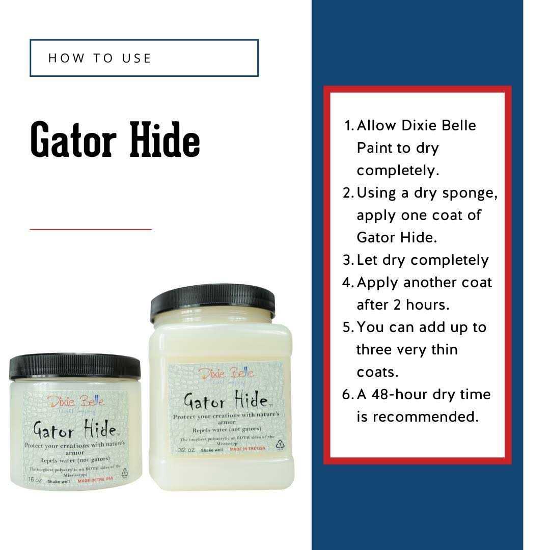 Gator hide is a Super tough polyacrylic clear top coat. Great for table tops, kitchens, or very high usage furniture / areas. Repels water. Use the dixie Belle sponge, roll or brush. Allow your finished piece to completely dry. Simply brush on a thin layer of Gator Hide. Let dry. After 2 hours, re-apply. Apply up to 3 layers allowing plenty of dry time in between. Sheen Level: low satin This product is listed under the following categories: Paint, Building Consumables, Painting Consumables, Hardware.