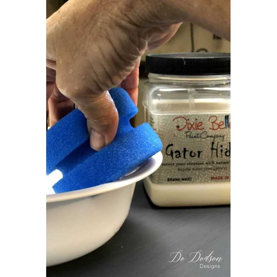 Our Toughest Top Coat, just like the name implies, it is as tough as a Gator’s Hide. Gator Hide is NON-yellowing and has a superior toughness that is perfect for your high traffic areas. Add Gator Hide to your chalk painted kitchen or bathroom cabinets for long lasting durability. Gator Hide is Water Repellant and our rock hard finish will leave your projects beautiful for ages. To use Gator Hide: Allow your finished piece to completely dry. Simply use our Blue Sponge to add a VERY thin layer of Gator Hide. Let it dry and after 2 hours, re-apply. Use Dixie Belle Sanding Sponge to gently sand between coats Let it dry 2 hours and repeat this up to 3 VERY thin layers to get a water repellent finish!