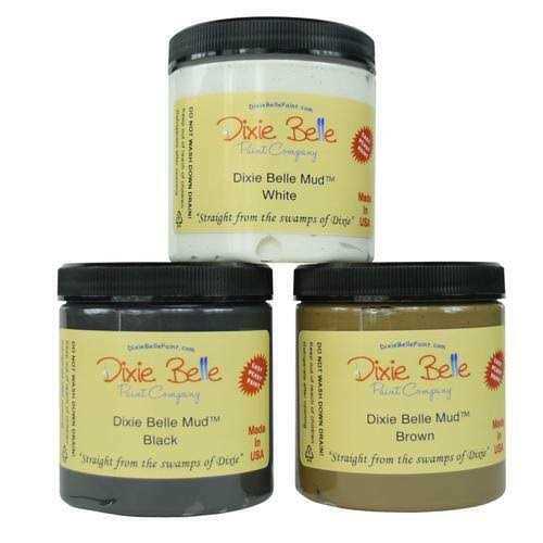 Dixie Belle Mud has many uses. For filling scrapes, gouges and holes, to creating textured finishes and embellishing you furniture with a raise stencil. fine texture allowing it to be sanded super smooth. 3 shades available: Brown Use Dixie Belle Mud to fill veneer, gouges, scrapes or even holes. Use to make a raised stencilled embellishment to your piece. After Dixie Belle Paint has dried, place a DBP stencil over your project and secure with adhesive or painters tape. Using your mud spatula, spread the mud over your stencil. Simply scrape any excess back into your jar. Gently remove your stencil. Now, you are left with an embellishment! Spread Dixie Belle Mud over a flat surface and use stamps, leaves or even some burlap to create impressions and other interesting elements. NEVER, never rinse the mud down your drain, clean utensils with baby wipes and throw away.