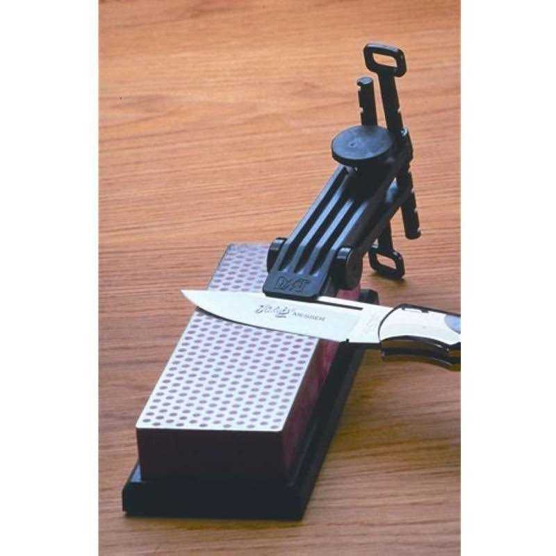 The DMT Knife Sharpening Guide can be used with any type of bench stone to provide a consistent bevel angle. Keeping a consistent bevel angle is absolutely critical if you re trying to achieve a truly sharp knife edge. To use this sharpening guide, just clamp the knife and fine-tune the bevel angle adjusters to the proper angle. Once you ve set up your angles the sharpening guide will keep your knife at the proper angle to the stone. There are seven settings on the Sharpening Guide. The angle you need will depend on the knife you are using, the height of the stone, and the setting you choose. With the seven settings you will have more than enough options to sharpen your knife at the proper angle. Made in the USA.