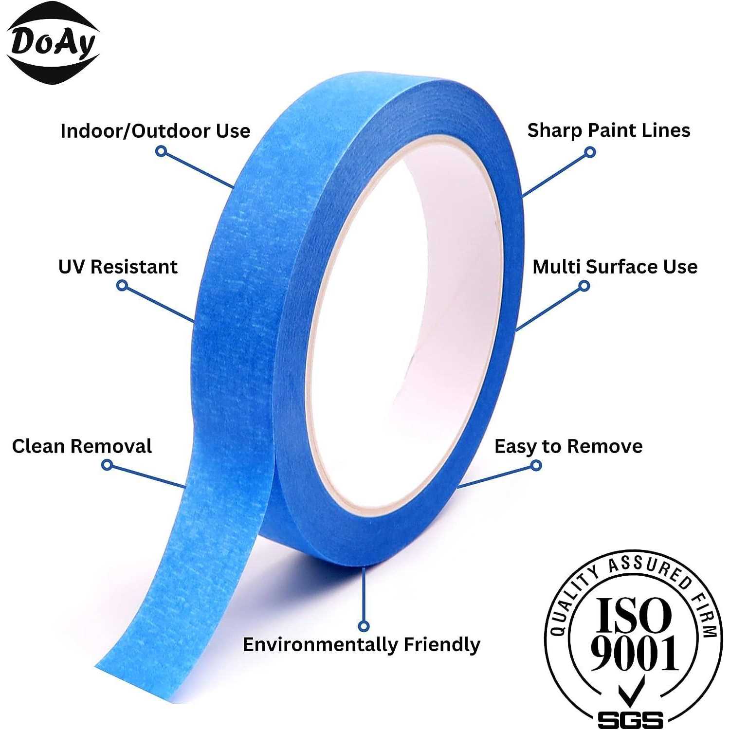 【VERY HIGH REMOVABILITY】: Incredibly flexible, no adhesive residue left after removal and Resistant to solvent and moisture. Perfect for professional painters. 【PRACTICAL AND QUALITY】: Create a sharp edge when quickly painting and Painters Masking Tape is manufactured in an ISO 9001 registered plant to meet worldwide quality standards. 【STRONG ADHESIVE】: Paint for several weeks with one tape application as our tape will stay to your surfaces for weeks but will not leave residue behind when removing. 【SAVE TIME】: Save time preparing for painting with our easy to tear crepe paper tape that will stick to almost all surface including wood, dry wall, painted dry wall, and more. 【THICK & SECURE】: It is frustrating when paint seeps under masking tape and stains the surface it is covering. Our blue painter’s tape is thick enough to ensure that the paint won’t wick under it. Its strong adhesive keeps it in place, sealing its edges as well to efficiently prevent paint bleed. 【SMART ADHESION】: Experience a masking tape that intelligently adheres while painting and effortlessly releases upon completion. Our innovative Smart Release Technology ensures a smooth and clean removal without any sticky residue, setting a new standard for painting precision. 【INDOOR & OUTDOOR USE】: Tackle painting projects in any environment with confidence. DOAY Painter’s Masking Tape boasts all-weather adhesion, making it the ideal choice for both indoor and outdoor applications. No matter the conditions, expect reliable performance and a professional finish. 【COLOR-LOCK TECHNOLOGY】: Say goodbye to color bleed and hello to vivid, well-defined edges. DOAY Painter’s Masking Tape features Color-Lock Assurance, a proprietary technology that seals edges securely, preventing any unwanted color seepage. Achieve pristine results on every project, no matter the complexity.