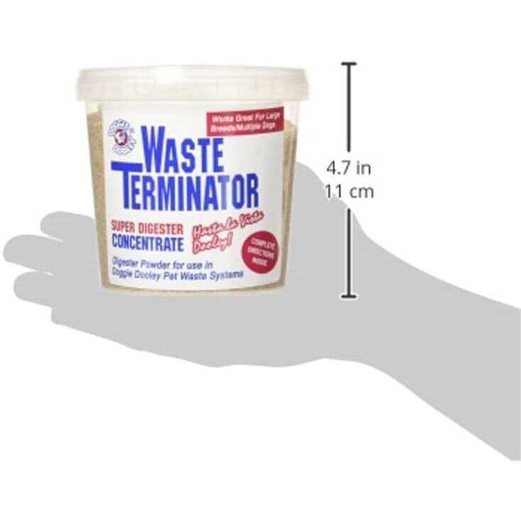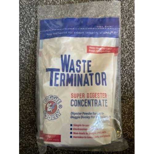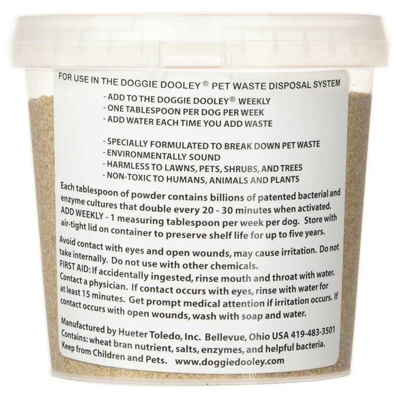 Doggie Dooley Waste Terminator Digester Powder, 1 year supplyn ITEM DESCRIPTIONnn360 grams of the Waste Terminator packaged in a handy re-sealable plastic tub. Our premium Digester Powder, contains twice the amount of enzymes and bacteria per scoop compared to our regular brand. Works will with larger breeds or for homes with multiple dogs. Harmless, non-toxic, helps control pet waste odors.
