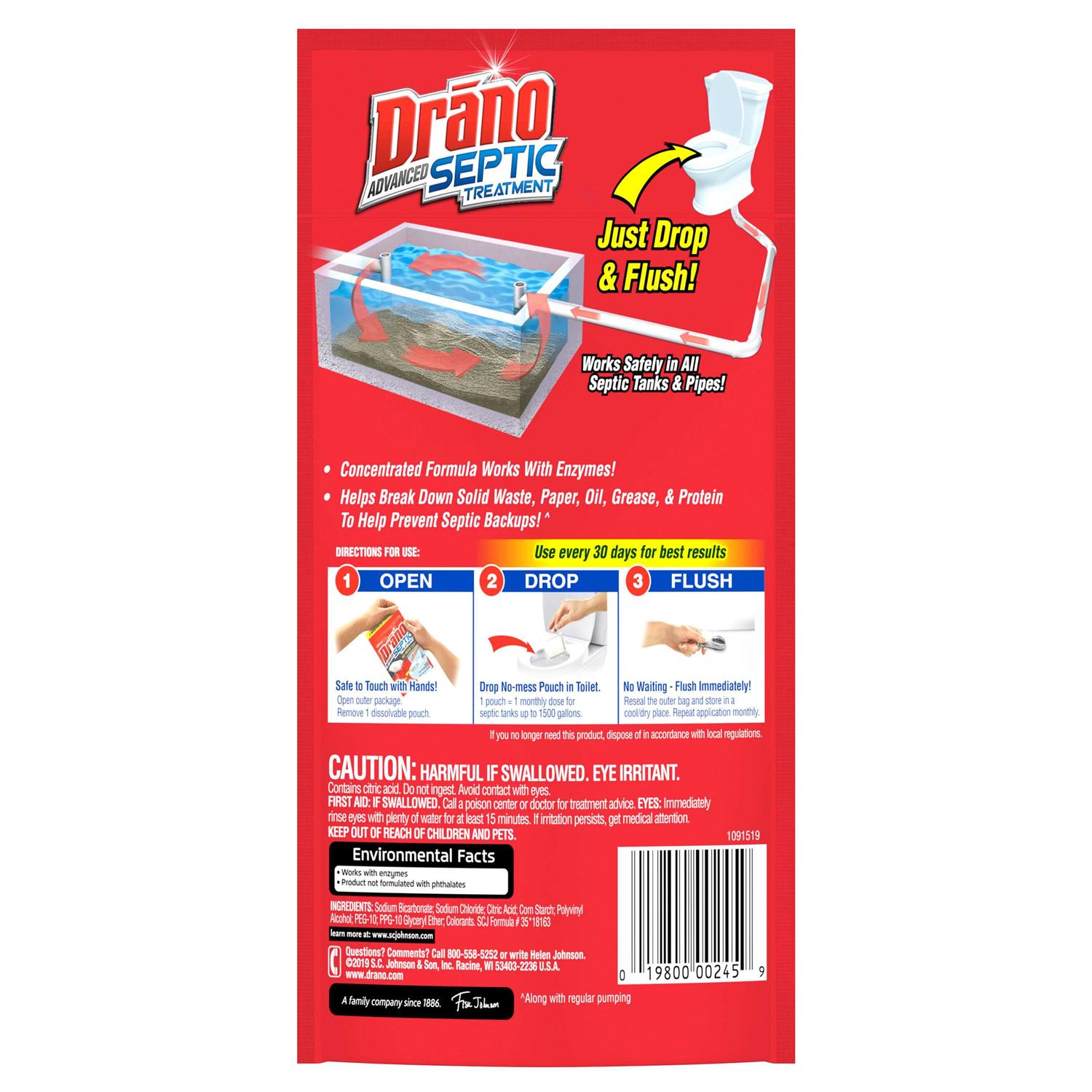 Drano advanced septic treatment helps you take care of your septic tank. the septic tank enzymes break down solid waste, paper, grease and protein. just drop the no-mess pouch in the toilet and flush.