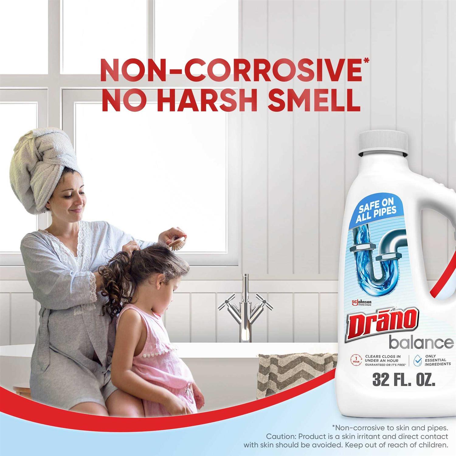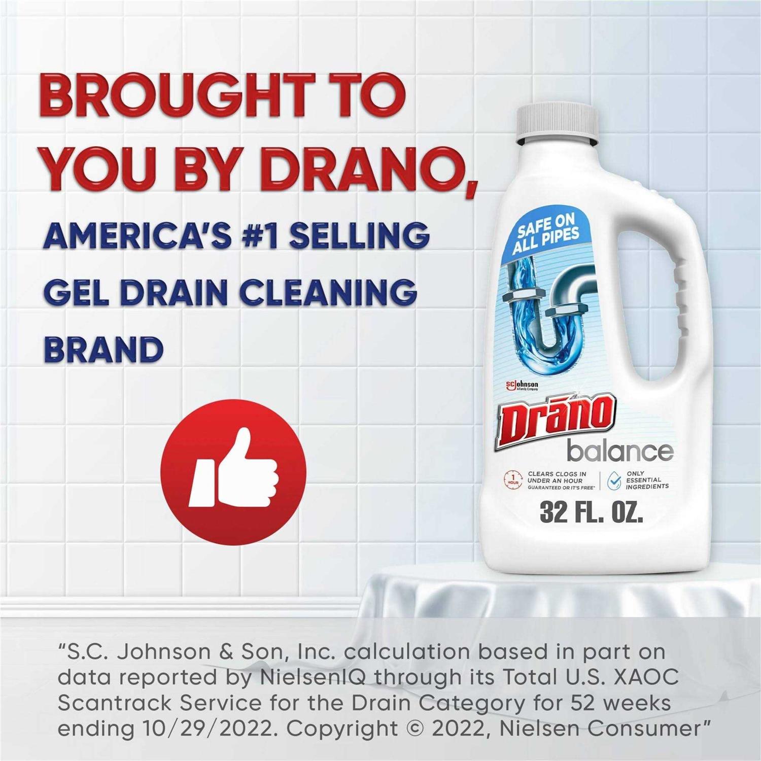 Introducing Drano Balance a sink drain cleaner that is formulated using only essential ingredients. Safe for use on all pipes, this unclogger liquid can clear clogs in under an hour, making it great for use as a shower drain cleaner or kitchen drain cleaner. Non-corrosive and with no harsh smell, this Drano gel creates an active foam that removes unpleasant odors while cleaning your pipes. As a drain declogger, Drano Balance is more effective than many all natural cleaning products and home remedies like drain snakes, plungers and baking soda. This sink clog remover is also easy to use. Just pour half a bottle slowly down a drain, wait 45-60 minutes, flush the drain, and repeat as necessary. Use Drano Balance regularly to help prevent larger clogs. Give it a try! Youll soon think this Drano liquid gel is the best drain cleaner you’ve ever tried! Drano Balance is brought to you by Drano Americas #1 Selling Gel Drain Cleaning Brandto skin and pipesS. C. Johnson & Son, Inc. calculation based in part on data reported by NielsenIQ through its Total U.S. XAOC Scantrack Service for the Drain Category for 52 weeks ending 10/29/2022. Copyright 2022, Nielsen Consumer LLC.