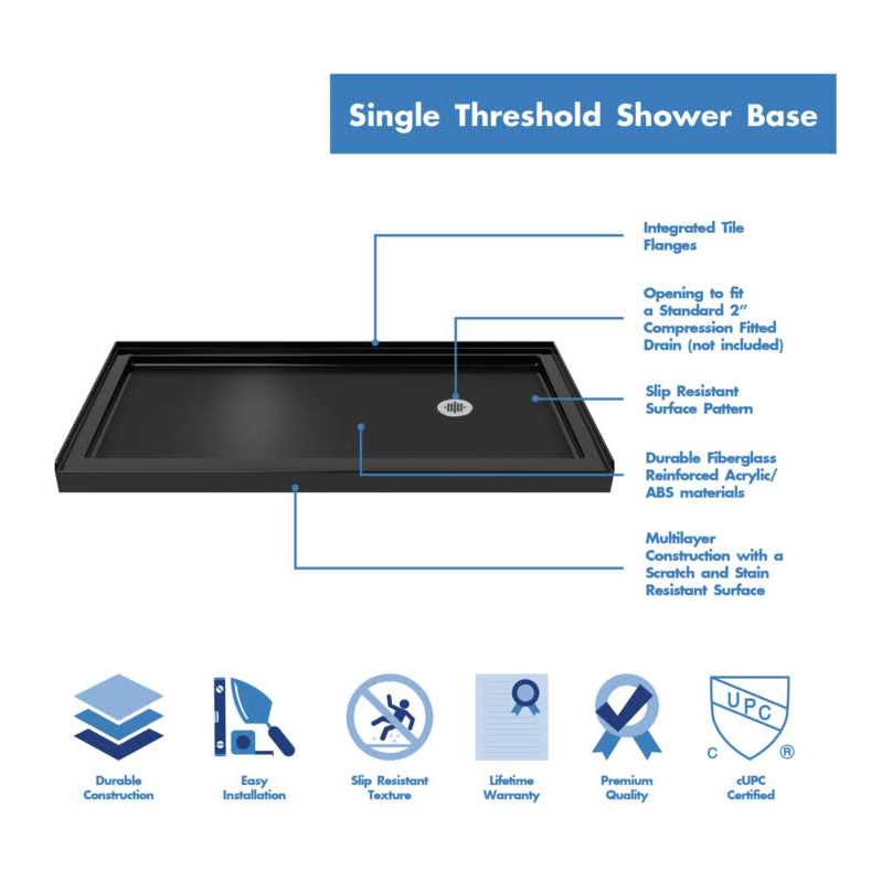 The DreamLine SlimLine single threshold shower base may be used in a custom shower project or combined with DreamLine Shower Doors for a complete shower installation or tub-to-shower replacement project. The modern shower bases (also referred to as shower receptors, shower trays or shower floors) have a low profile design for a clean polished look. DreamLine shower bases deliver a smart alternative to the time and cost involved with custom tile, with a product that is easy-to-install and an excellent value. Made of attractive high gloss Acrylic/ABS materials, the bases are fiberglass reinforced for durability. Each single threshold shower base comes standard with a slip-resistant textured floor pattern, 3-side integrated tile flanges and an opening ready for a standard compression fitting drain. DreamLine offers a collection of cUPC certified low profile shower bases. These shower trays are cUPC certified, which affirms they are in compliance with applicable American and Canadian codes and standards. NOTE: DreamLine SlimLine Shower Base dimensions are provided for rough opening measurements (against the studs), while DreamLine Shower Enclosure dimensions are for finished opening measurements (finished/tiled walls). NOTE: DreamLine shower bases will always be larger (approximately 2 in.) than the corresponding DreamLine shower enclosures/doors. Please, take this information under advisement when ordering your Shower Base and Shower Enclosure separately.