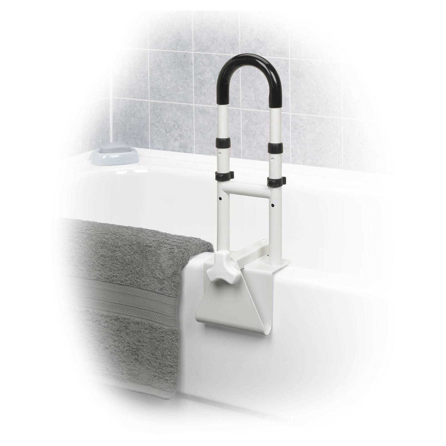 Drive Medical RTL12036-ADJ Easy to install without needing tools, Equip your tub with extra support with this Clamp on Tub Rail. It is designed to fit just about any style of bathtub. Sturdy handle design and a stainless steel locking mechanism both provide added security for up to 300 lbs., while non-wearing rubber pads ensure the product will not scratch your tub’s surface. The attractive white powder coated steel frame is durable and aesthetically pleasing. The angle of the grab bar is parallel to the shower wall. The adjustable width clamp attaches by turning the locking mechanism which tightens the rubber pads on all bath tub contact points. The rubber pads prevents scratching of the tubs surface and ensure a secure fit.
