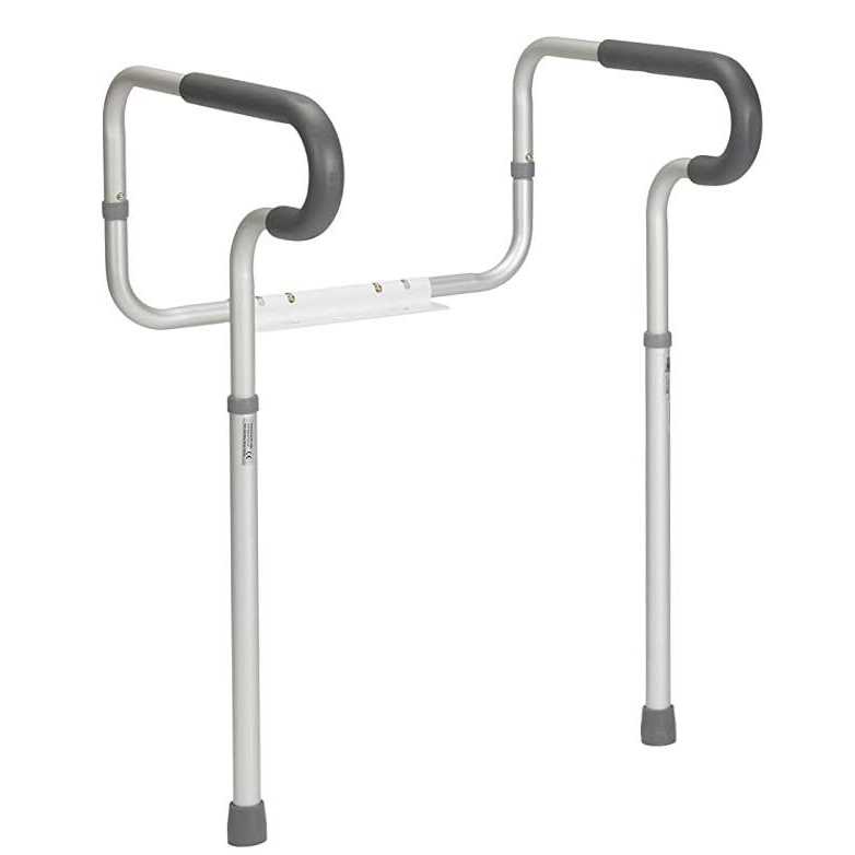 Toilet safety frame, 300 lb weight capacity. Anodized aluminum is sturdy and lightweight. Armrests provide additional comfort and support. Powder coated aluminum bracket easily attaches frame to toilet. Arms are height and width adjustable.