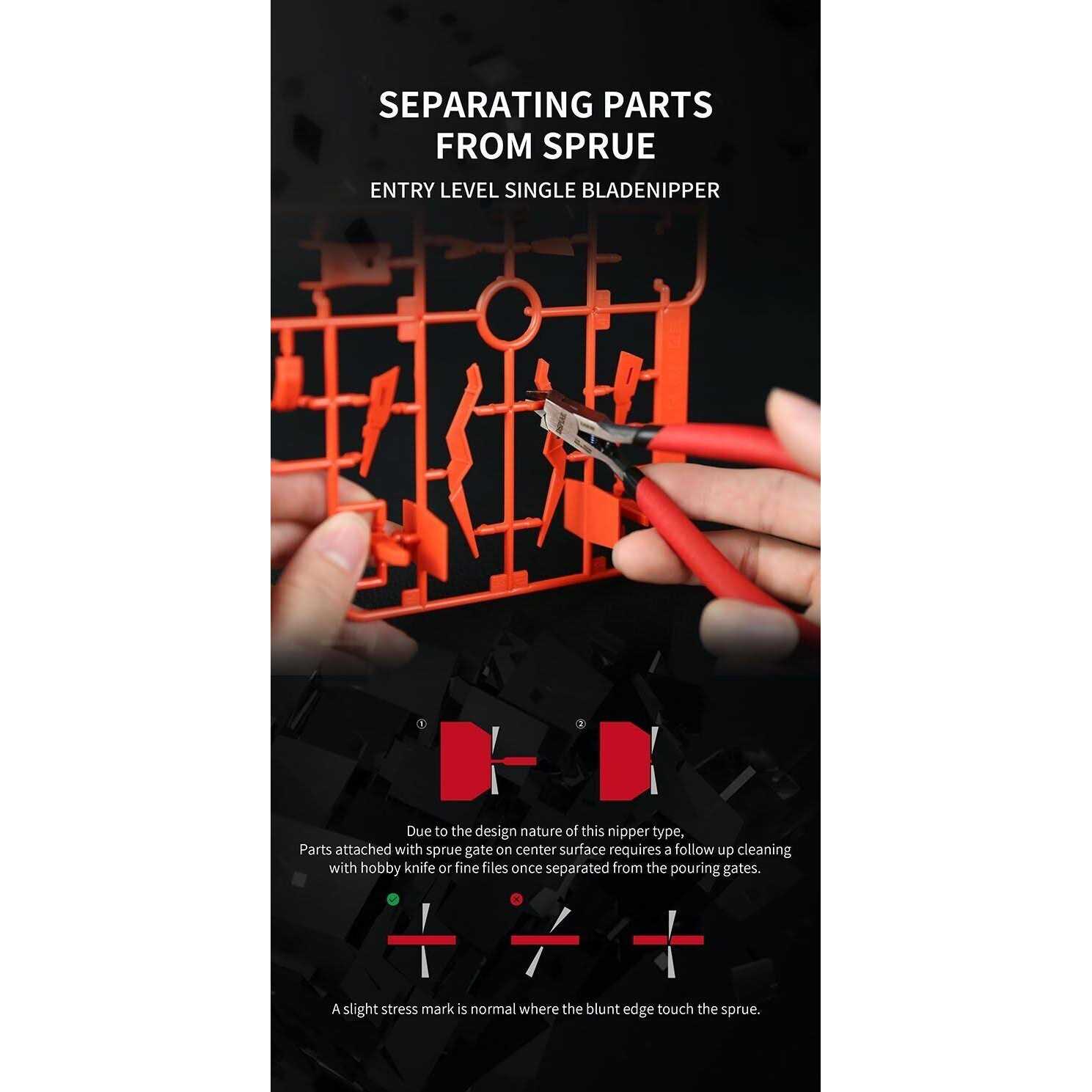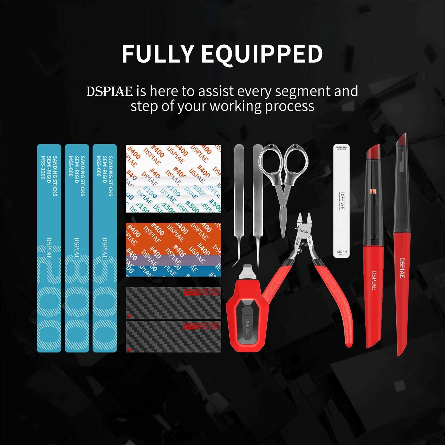 Departure” Tool Combo Set TC-S01 DSPIAE Plate Pickup Basic version single edge cutter Due to the height difference design of the single-edged scissors, the centre nozzle needs to be trimmed with a pen knife or file after cutting. When cutting the runner, it is normal that the runner and blunt surface have slight indentation Engraving pen repair parts Daybreak Carving Pen For nozzles that cannot be handled by the scissors at one time, use the dawn engraving pen for secondary trimming Please use the engraving pen in a standardized manner, and do not use it for dangerous operations to avoid injury. Please make sure to install the nib in place to avoid the nib falling off during use. After use, please cover the pen cap to prevent accidental drop from causing injury or product damage. The nib of the engraving pen is a consumable item, please replace the blade in time after long-term use, so as not to affect the cutting effect. Part grinding Semi-Rigid Grinding Stick (General Grinding) Carbon fibre grinding plate + durable adhesive sandpaper (flat grinding) Sponge gauze (surface grinding) Glass polishing file (transparent parts grinding) Fine operation Straight tweezers | Bend tweezers to pick up water stickers or small parts for fine operation Parts seepage Phoenix Feather Liner Pen Submerge the seepage liquid over this calibre Dip in an appropriate amount of seepage liquid and do not exceed the calibre. Gently scrape off excess line seepage on the mouth of the bottle. After determining the position of the seepage line, press lightly with the tip of the pen, and the line seepage liquid will flow into the groove by itself. After the line seepage liquid is evenly covered, lift the line penetration pen, and wait for it to dry to complete the line penetration. (It is recommended to use DSPIAE T-08 enamel paint thinner to wipe off excess line seepage) Line pen maintenance Just wipe it clean after use (it is recommended to use DSPIAE T-03 coating tool cleaning fluid) Wrong assembly and disassembly push opener Putting away the cutter head in time after use can effectively avoid the risk of dropping and damaging the cutter head. Please handle with caution as this product contains sharp parts. Please store it in time after use. Package included: TC-S01 Starter Tool Set 1 x Tool Storage Box 1 x Basic Single Edge Cutter 1 x push opener 1 x Daybreak Sculptor 20 x Replacement hobby knife blades 1 x Durable Sponge Sandpaper #400 (3mm) 1 x Durable Sponge Sandpaper #800 (3mm) 1 x Durable Sponge Sandpaper #1200 (3mm) 1 x Heavy Duty Adhesive Backed Sandpaper #400 1 x Heavy Duty Adhesive Backed Sandpaper #800 1 x Durable Adhesive Backed Sandpaper #1000 1 x Durable Adhesive Backed Sandpaper #1200 1 x Durable Adhesive Backed Sandpaper #1500 2 x Carbon Fibre Sanding Plates 1 x Semi-rigid sanding stick #600 1 x Semi-rigid sanding stick #800 1 x Semi-rigid sanding stick #1200 1 x Glass Polishing File 1 x straight tweezers 1 x Angled Tweezers 1 x scissors