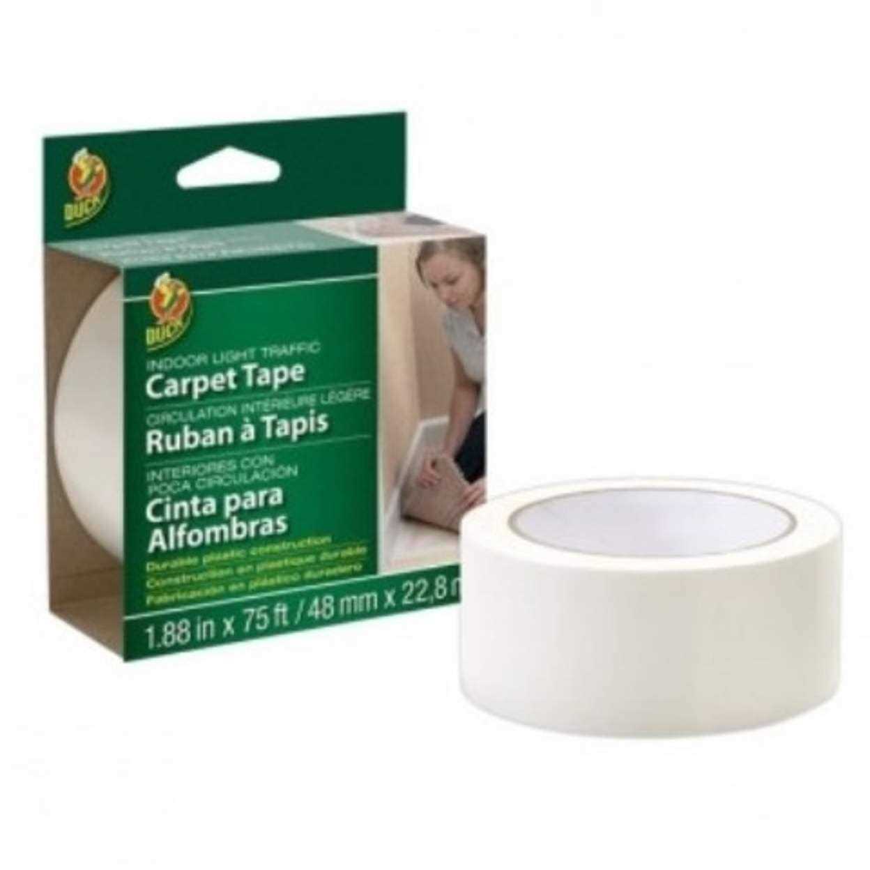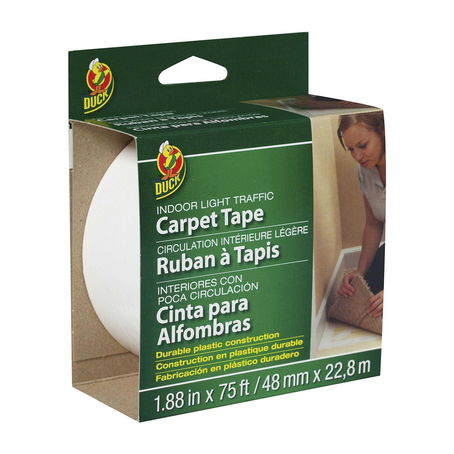 Duck Brand Light Traffic Plastic Carpet Tape is designed use with foam/rubber, woven polypropylene, and jute-backed carpets. It has a double-sided permanent adhesive, providing excellent adhesion to both smooth and rough surfaces. The tape features durable, tear-resistant cloth construction, ideal for high-traffic areas such as living rooms and hallways and is recommended for permanent, indoor carpet installation. The tape is 1.88 inches wide and 75 feet long. Duck Brand carpet tapes help keep rugs in place, quickly join carpet pieces and create safe, no-slip surfaces.