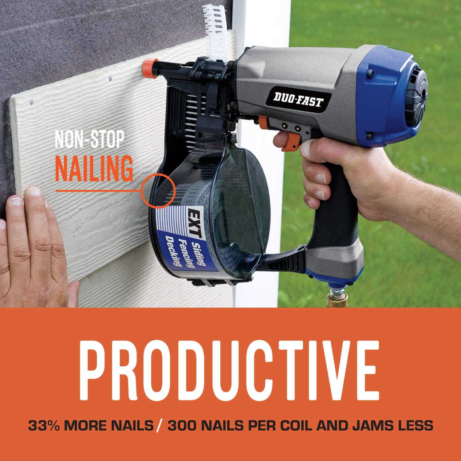 Duo-Fast high quality plastic collated nails offer these outstanding advantages: flexible, strong plastic used in collation won’t allow nails to break apart even in extreme conditions. Consistent on center nail heads- less jamming. Plastic is weather fluorescent.