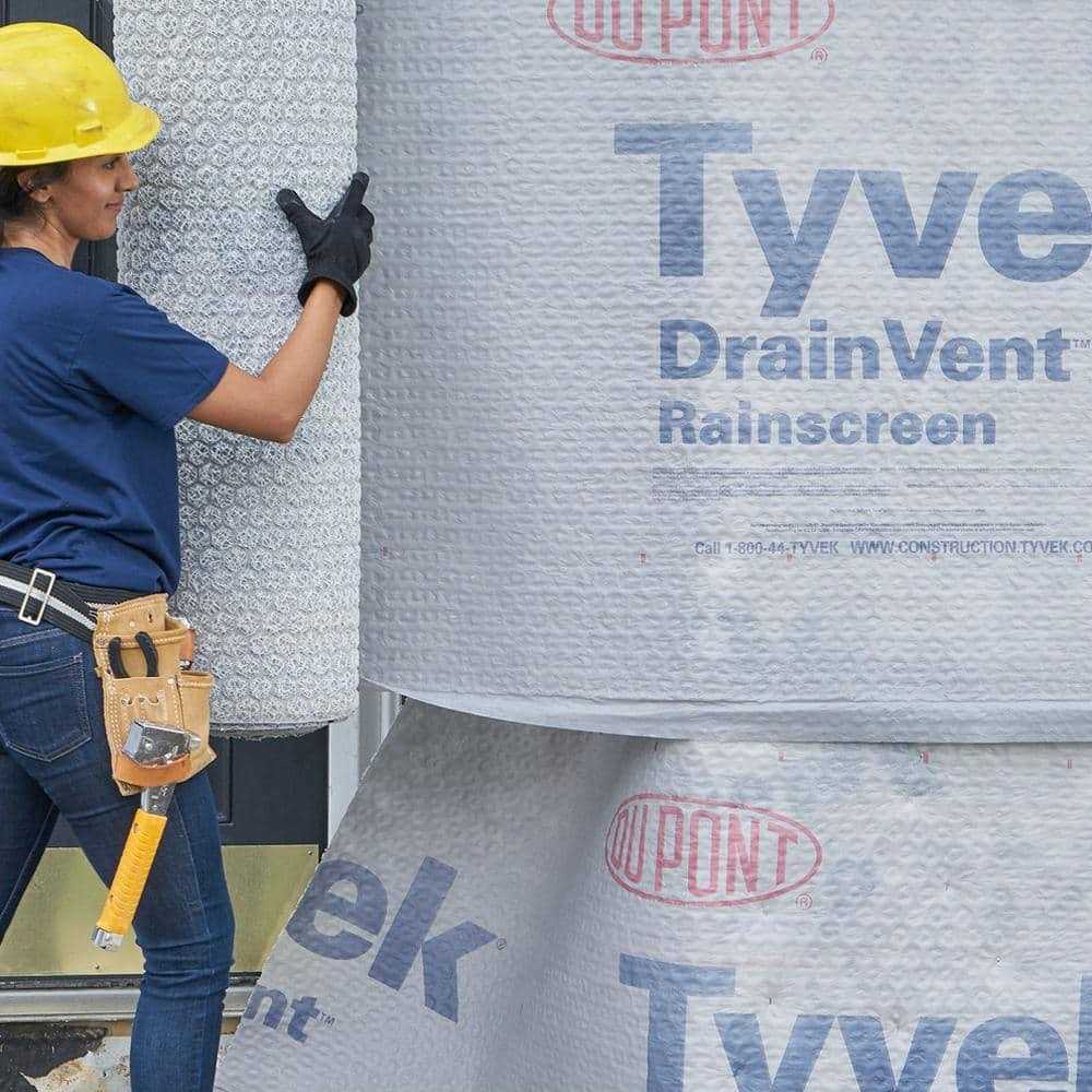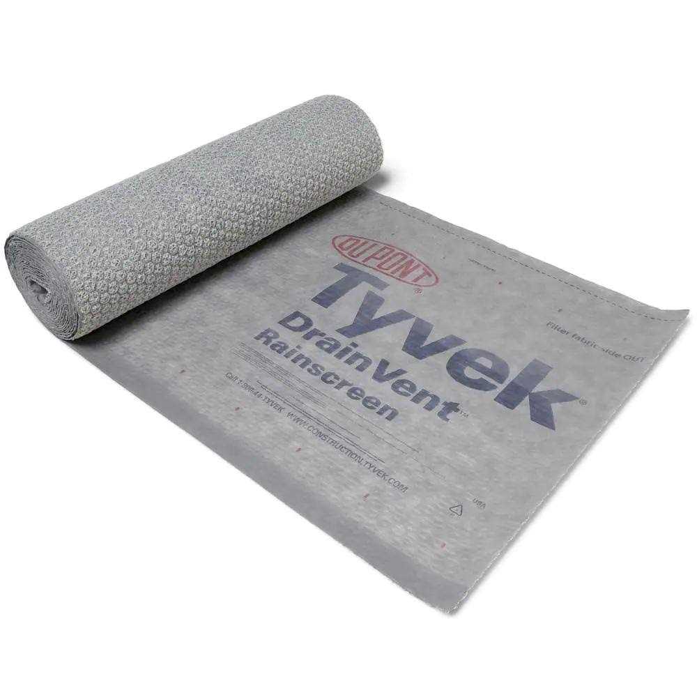 Tyvek DrainVent Rainscreen provides water drainage and air ventilation to the wall system when installed behind exterior claddings such as stucco, stone veneer, brick, wood and fiber cement lap siding, or metal panel systems. The patent-pending honeycomb design lays flat while providing multi-directional channels for drainage and airflow which is easy to install with 1/2″ staples or nails. It also allows for a tight roll around corners.Each roll contains a 3″ flap of filter fabric to provide an overlap of the lower courses of DuPont Tyvek DrainVent Rainscreen. The flap can also be folded behind drainage mesh along the bottom of the wall to provide an insect screen. The heavy-duty filter fabric prevents mortar and stucco infiltration and also creates a 6 mm (.25″) gap that helps prevent rot, cracking, and peeling problems by promoting moisture movement and ventilation in the wall cavity.The mold and mildew resistant Tyvek DrainVent Rainscreen also qualifies as an intervening layer for building codes prescribing two layers of WRB behind stucco or stone veneer to separate cladding from the WRB. The greater than 100 perms and Class “A” fire rating per ASTM E84 offer peace of mind with peak performance.