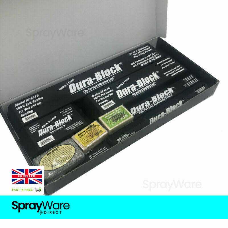 Features and Benefits: Dura-Block conforms to the panel curve Will not dig into fill material Hook and Loop allows use of money saving Hook and Loop Paper Known worldwide as the gold standard in blocks Product is machined to a perfect, flat finish This 7 piece Dura-Block Kit contains the most popular Dura-Blocks in money saving Hook and Loop attachment. This allows reuse of paper when changing grits. The patented materials used in Dura-Blocks allow them to conform to the panel curve yet the surface hardness prevents digging into fill materials. Simply the best blocks available.