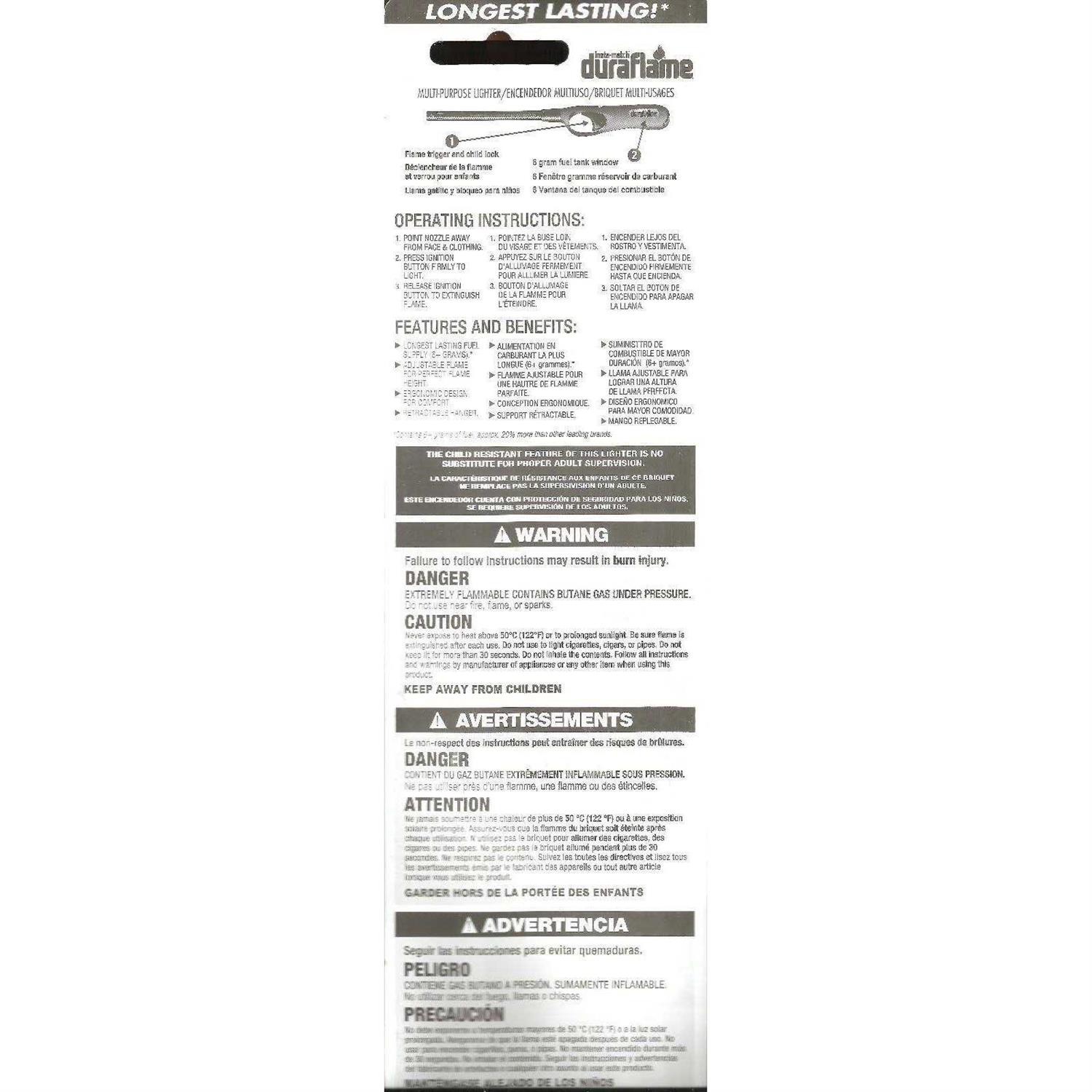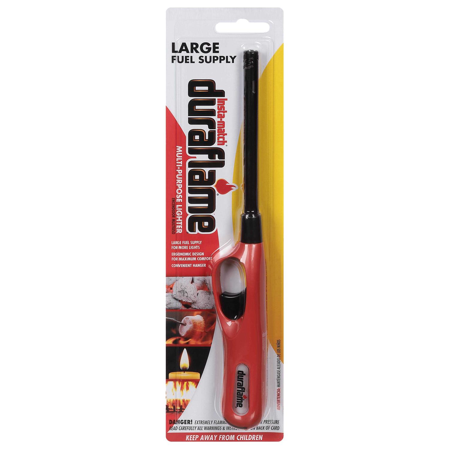 The Duraflame Insta-Match Utility Lighter is a long-lasting multi-purpose lighter, with a powerful flame and a large fuel supply for more lights than ever. This lighter contains 6 grams of fuel, 20% more than other leading brands. Includes a simple, one-step child resistant safety mechanism and a safe and sturdy nylon fuel tank with monitoring window. Features an ergonomic design for maximum comfort and a retractable hanger for quick and easy storage. Includes an adjustable flame for perfect flame height for lighting candles, charcoal, wood and more.