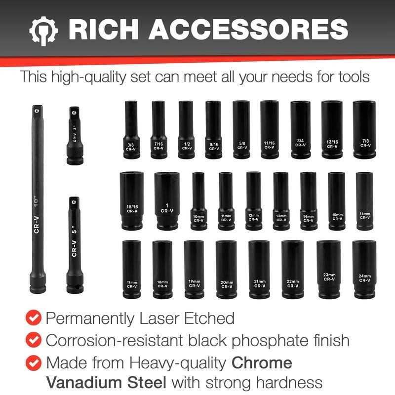 EACELIY 29pcs 1/2 Socket Set, Drive Deep Impact Socket Set, Including 3 , 5, 10 Impact Extension Bar, Standard SAE and Metric