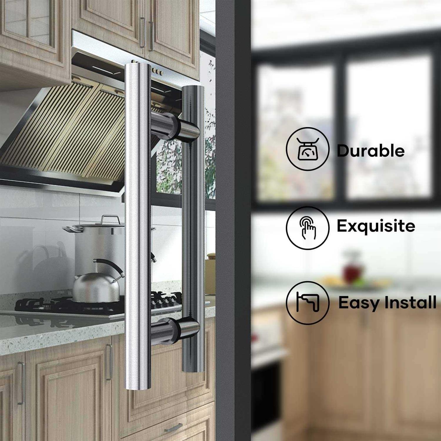 SUPERIOR QUALITY — Solid stainless steel,brushed surface,anti-rust anti-corrosion ensures years of beauty and longevity.All items have been multiple inspected before on market. FINE DESIGN — Smooth polished chamfered edges,ergonomically design prevent any unexpected injury and provide a more comfortable handing feeling. DUAL USE — Fit for Glass Door (between 1/4”and 1/2”(6mm~12 mm) ) and Wooden Door (between 1-3/8” and 2- 3/16”(35~55 mm) ) PACKAGE — (2)Bar Pull Handle,(4)Round Pad,(2)Screw for glass door,(2)White rubber pad for glass door,(2)Screw for wooden door.