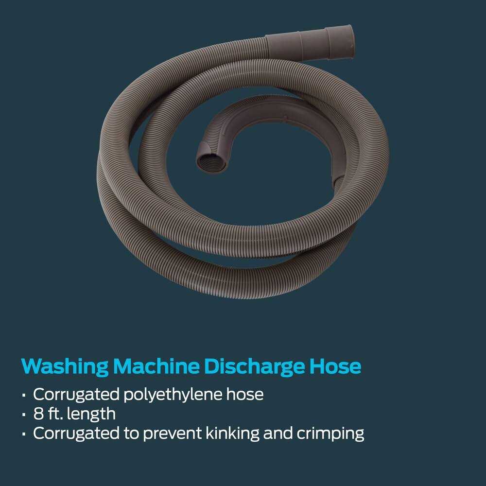 The 8-ft corrugated washing machine discharge hose features corrugated polyethylene that bends easily for an easier installation in tight spaces. The drain hose is designed for a universal fit and connects your washing machine drain outlet directly to the drain. Corrugated polyethylene hose with 180 degree hook. or 1-1/4-in inlet connection”. Universal sizing- can be cut to fit specified drain outlets. 1-in outlet connection.