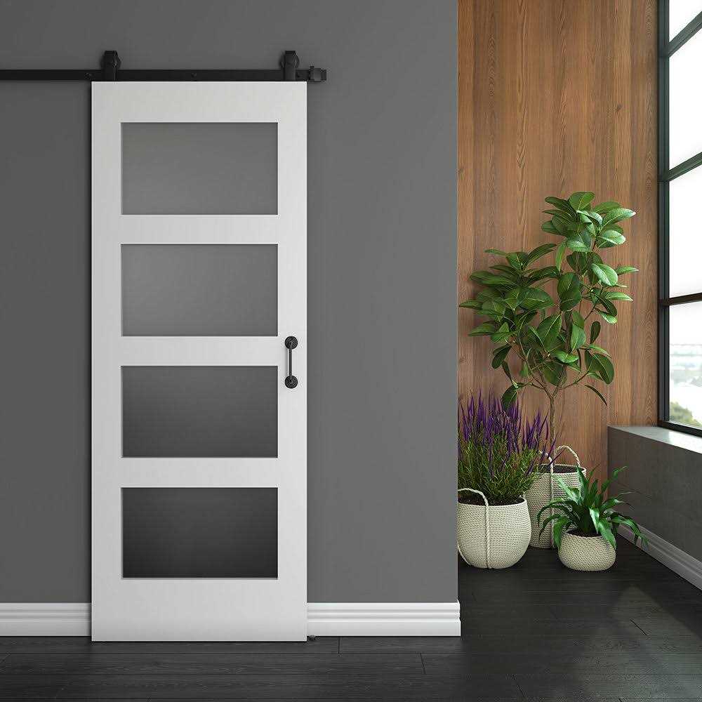 EightDoors 4 Lite Frosted Barn Door is designed to provide timeless beauty. The tempered frosted glass lets light through, saving on energy while offering privacy. A barn door comes as a high demand product: while standard doors will take up a considerable area to swing open and close, sliding barn doors only need adequate wall space, meaning you can make maximum use of your square footage for furniture and decor. This solid wood door is made from planted forest trees in accordance with FSC regulations, being an environmentally friendly product. For a great and smooth finish, MDF veneer is used on the faces with 3 coats of white primer so you can add the finish of your choice to offer a bit more protection to the wood to last for the years to come. This door has a trimming allowance of 1/4-in. on each side and 1-in. at the bottom. Any edge that is trimmed must be sealed or ed to protect from moisture. Pair it with EightDoors Black Matte Interior Hardware Kit for a seamless installation.