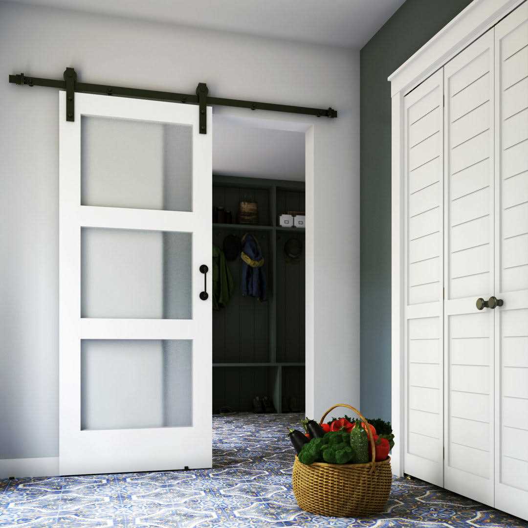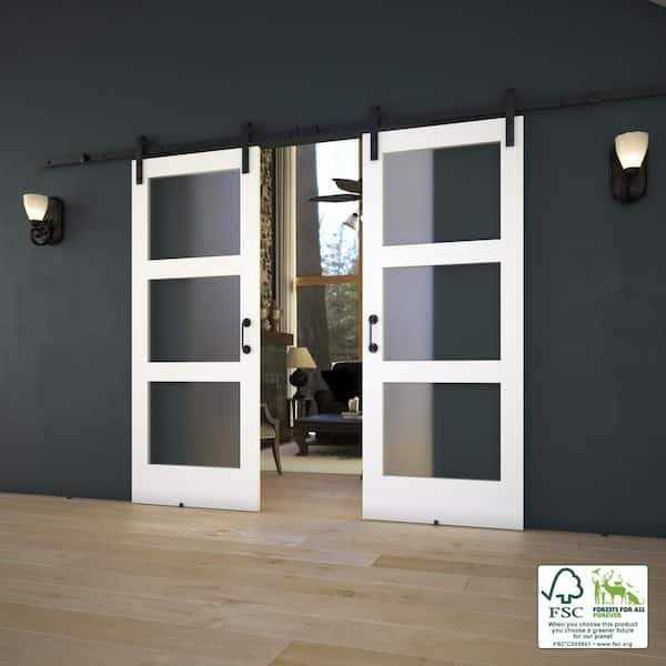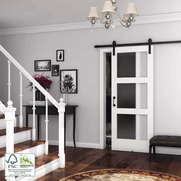 eightdoors 32 in. x 84 in. 3 Frosted Glass Solid Core White Finished Interior Barn Door Slab, White Painted