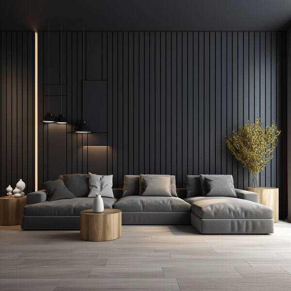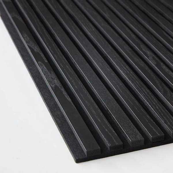 The acoustic slat vinyl wall panel range is a beautifully designed wood strip decorative wall and ceiling panel which boasts high-quality acoustic properties. The panels can be easily applied to both walls and ceilings – modern styling personified in every way. The natural wooden range is produced with a luxury quality, smooth wood veneer finish. Wood strips with a clean, modern appearance are mounted onto a uniquely designed, recycled acoustic felt material. Fast and simple installation allows you to quickly transform any space Each box contains 2 panel measuring 106 in. x 12.6 in. covers about 18.6 sq. ft. These panels will join next to each seamlessly with no join line showing. Color: Emboss Black.