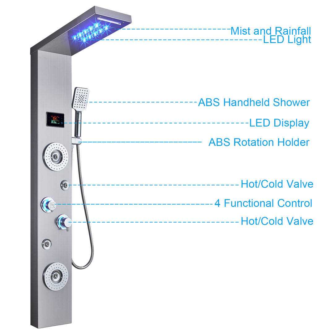Premium multi-function shower massage panel with LED shower head for home and commercial use. Panel’s body is made of 304 stainless steel, cool 4 functions: rainfall, waterfall, massage jets, 3 setting hand shower. The system has hot and cold integrated mixing valve controls and diverter to redirect water from one function to another. Paired with the fact that it is pre-plumbed for easy installation, makes easy to love for years to come. This excellent shower tower will provide you a comfortable experience, drive away fatigue, relax your mind and body after showering. Luxury color, easy to match modern room decorations.