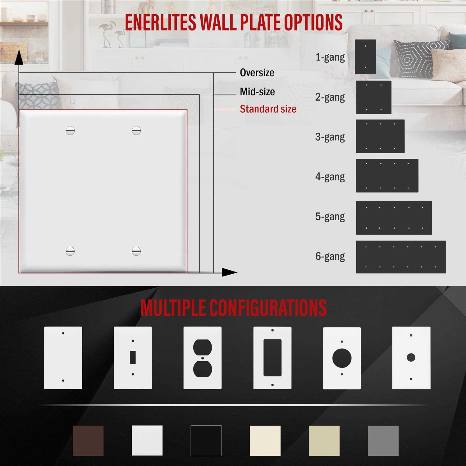 Enerlites unbreakable and undeformable blank wall plate. Enerlites wiring devices line of wall plates are designed and manufactured with high quality material polycarbonate! Enerlites wall plates are one of the best quality of its kind, and meet all applicable standards. Enerlites manufactures their wall plates in all sizes including standard, mid-size and oversize to guarantee that there is a wall plate to fit every device. Enerlites wall plates all feature a sleek, decorative finish and appearance. The screws included with this wall plate are pre-painted ensuring the colors will match perfectly giving it a flush look. This wall plate is designed to cover any openings in your wall where no outlet or switch is needed. Unlike many other brands, which use nylon material, Enerlites wall plates are made of an unbreakable polycarbonate material. Nylon wall plates are also unbreakable, but it is easy to bend or twist during installation, transportation or packaging; once it does, it is near impossible to get it back to its original shape. Other wall plates made by popular brands are made of brittle materials making them prone to breakage. Enerlites wall plates are made of polycarbonate, which makes the wall plate very flexible and unbreakable, while still keeping the sleek, smooth look even after installation. Enerlites wall plates are ideal to retrofit any installation for contractors and designers featuring a high quality product at a low cost. With wide choices in color and size, Enerlites offers 1 gang, 2 gang, 3 gang, 4 gang and even 5 gang sizes to be the switch cover of choice for toggle switches, double switches and many others. Find your perfect switch cover plate here!