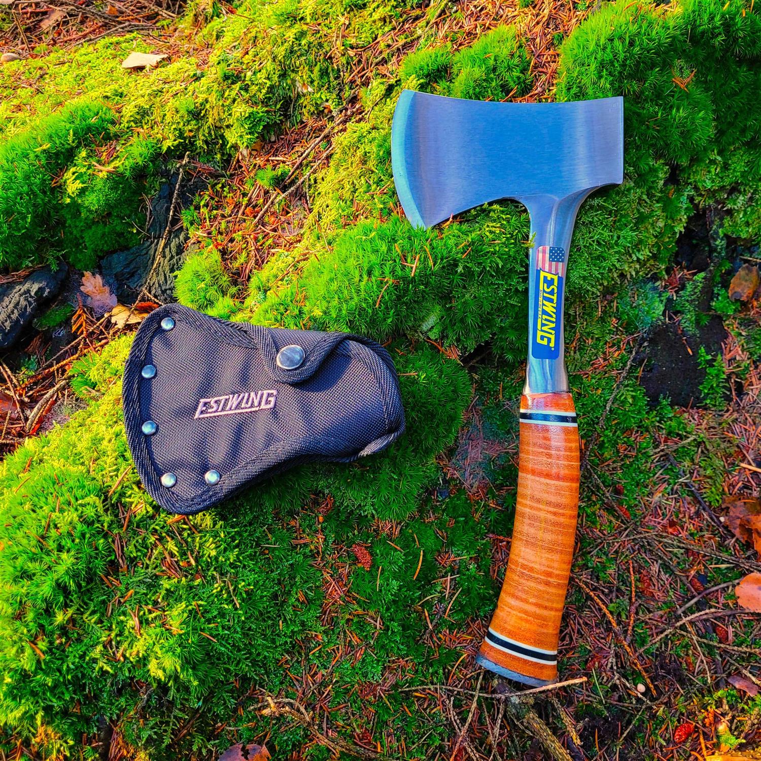 Estwing E14A 12″ Sportsman’s Axe With Leather Grip Head and handle forged in one pieceFully polished with genuine leather grip and sheathAll steel construction2-3/4″ cut edge12″ L14 ozEstwing’s world famous 14 oz. sportsman’s axe is the choice of outdoorsmen everywhere. Both the head and handle of the axe are forged in one piece and are fully polished. This classic axe offers unsurpassed balance and temper. It has a genuine leather grip that is sanded and lacquered for a beautiful finish. This axe also comes with an attractive genuine leather sheath. It has a tempered thin 2-3/4″ cutting edge for easy cutting. A must for all campers and outdoorsman alike! Made in the USA. Protect your eyes from flying particles and dust. Always wear safety goggles. Bystanders shall also wear safety goggles.
