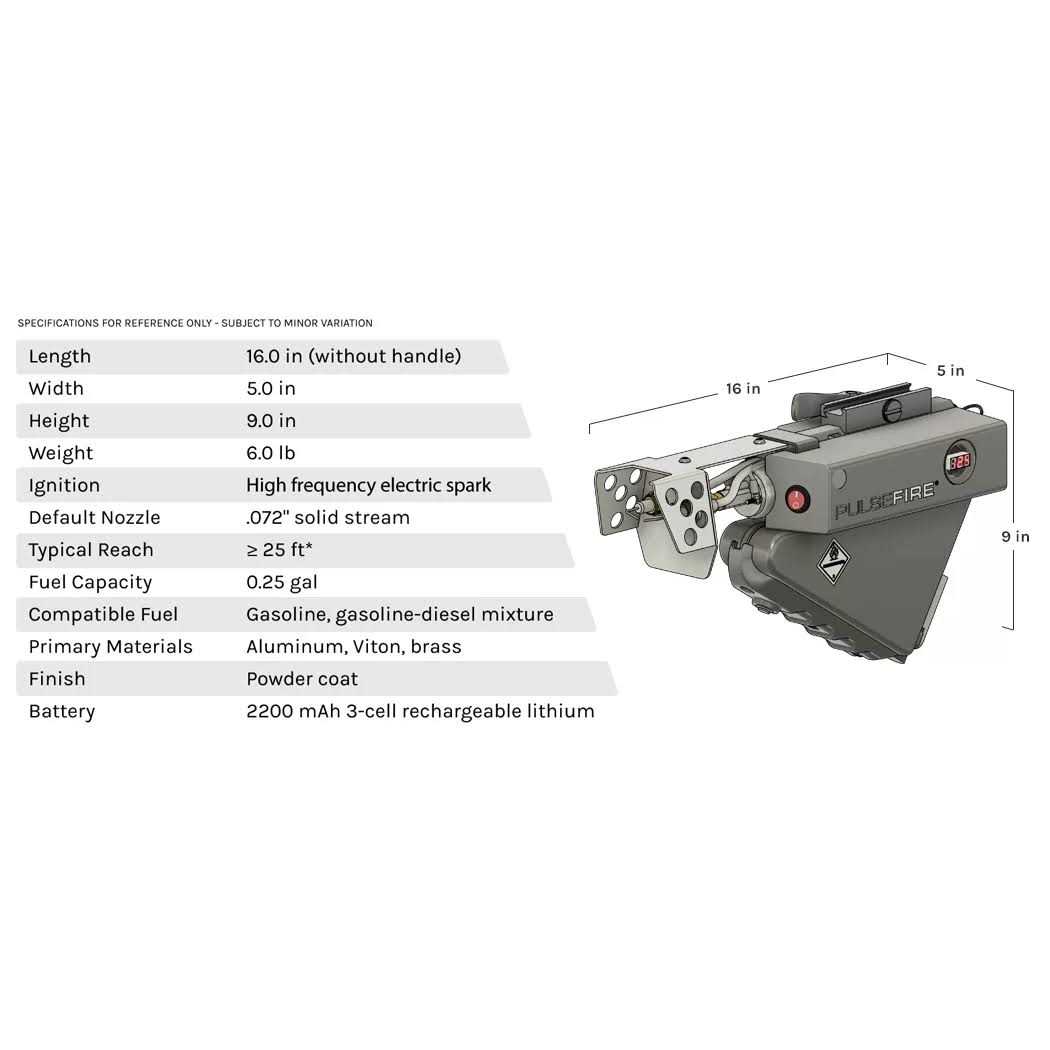 The Pulsefire LRT system in an underbarrel capable form factor. With the same 25-foot reach and about 20 seconds of fuel capacity, this compact configuration maximizes versatility. Use it fully handheld, mounted to a picatinny equipped device or even with the Pulsefire Backpack Kit using a simple male-male adapter fitting on the fuel hose. Includes battery and battery charger.