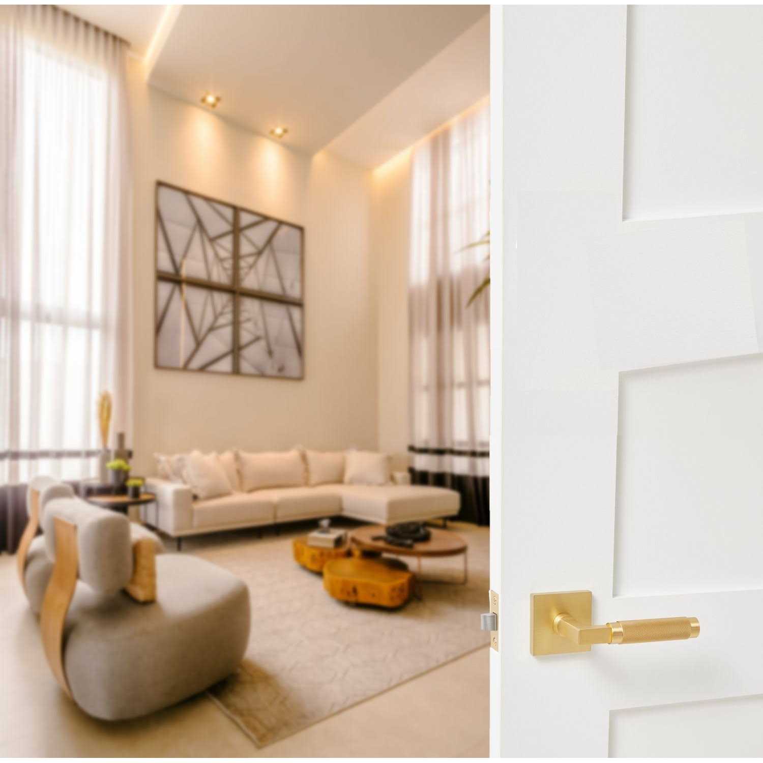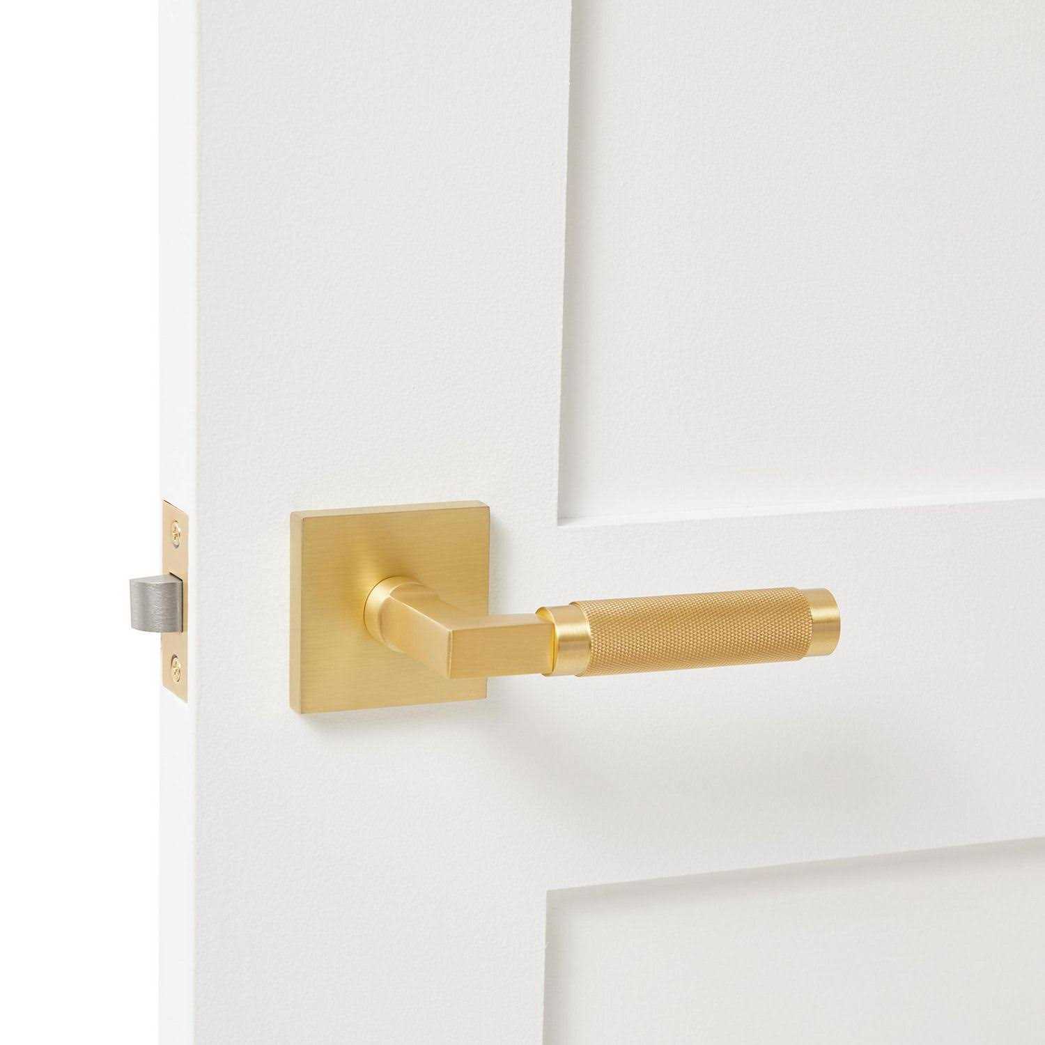 This door handle is cast from a solid piece of brass. It has a modern style and it is paired with our square rose/backplate. the lever is knurled in a diamond pattern with smooth edges. The finish is satin brass ( us4 gold). Explore Hardware. Color: Gold.