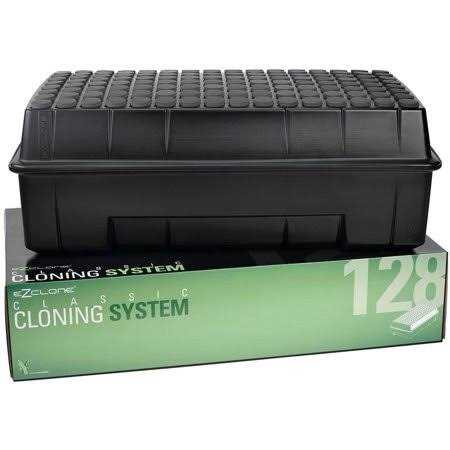 The new EZ-Clone Lo Pro 128 overall height has been reduced by four inches, while increasing the structural integrity of the new proprietary Lid and Reservoir. Manufactured from durable UV protected HDPE plastic. The Lid has alpha numeric symbols formed directly into the plastic, which allows simple identification of multiple strains of cuttings, and comes with four way finger slots for improved Cloning Collar extraction. The Reservoir has an increased lip height, with an extended flange and drainage gutters, to ensure a leak-proof design, and improved interface when opening the system to view cuttings. The water pump has an extended baseplate and additional suction cups to prevent tipping. It also includes four different colored cloning collars. The new EZ-Clone Lo Pro 128 overall height has been reduced by four inches, while increasing the structural integrity of the new proprietary Lid and Reservoir. Manufactured from durable UV protected HDPE plastic. The Lid has alpha numeric symbols formed directly into the plastic, which allows simple identification of multiple strains of cuttings, and comes with four way finger slots for improved Cloning Collar extraction. The Reservoir has an increased lip height, with an extended flange and drainage gutters, to ensure a leak-proof design, and improved interface when opening the system to view cuttings. The water pump has an extended baseplate and additional suction cups to prevent tipping. It also includes four different colored cloning collars.
