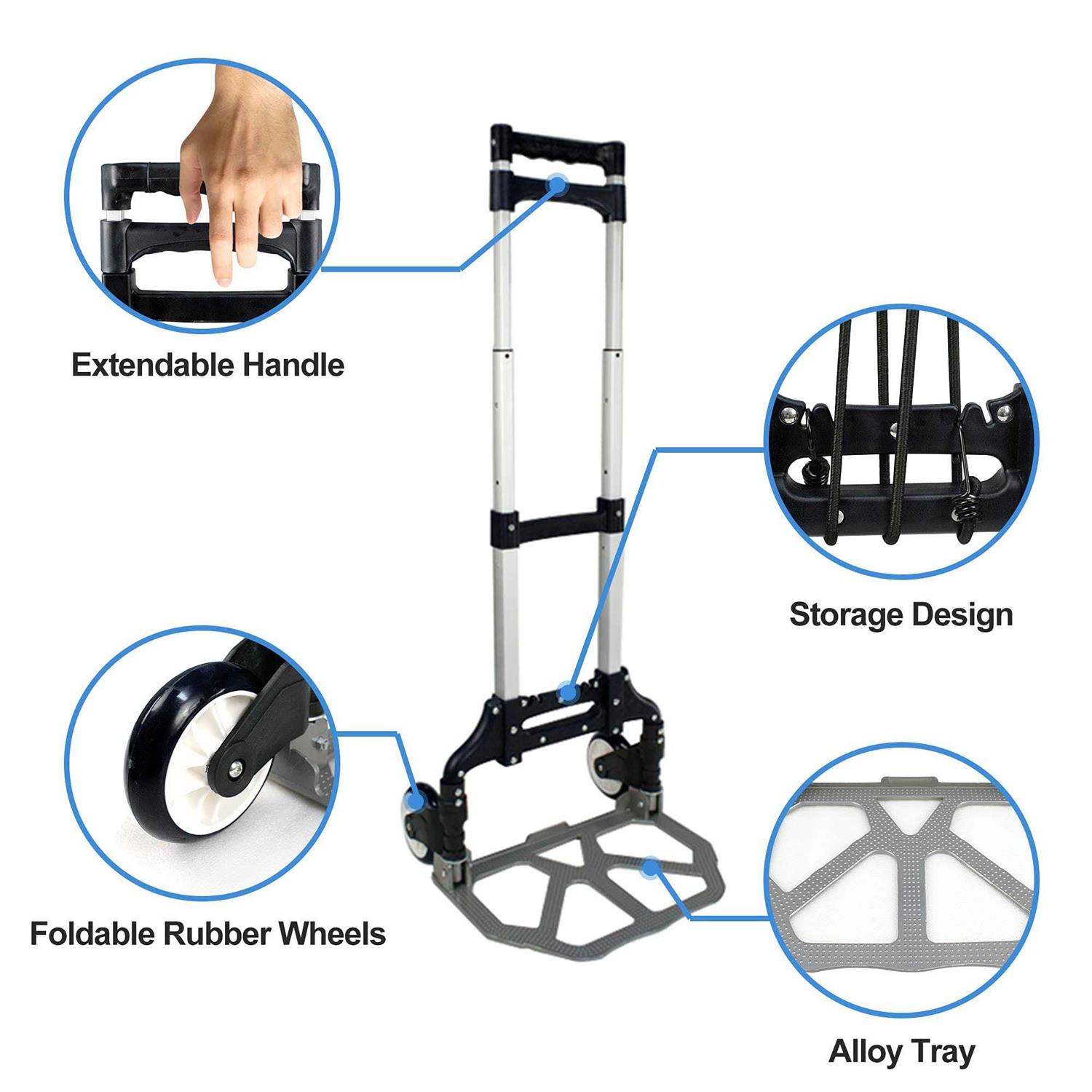 ?? Solid Construction to Last for Years?- Heavy Duty With Solid Aluminium Construction. Have the ability to Hold Up to 176lbs goods at a time.?? Light Weight & Folding Feature?- Can Be Folded Up Easily in seconds to be put in your car or for easy storage and take it to move the goods anytime when necessary. With the compact size and light weight, you can put into the backpack when not in use and wont feel heavy.?? Premium Rubber Wheels?- Two abs plastic wheels (no air required) roll smoothly and help frame fold to just over 2 inches thick.The ball-bearing wheels enable the cart to be walked smoothly on nearly any floor such as stone, carpet etc.?? Labor saving tips?- Push the Extended handle to the base first when folding the handle. Then shrink the extended long handle. ?? Bonus Black Bungee cord for strapping the language to add security.?? Multi Usage?- Ideal for the transport of tools, boxes, DIY materials or family movement, travelers, trade fair exhibitors, office or shopping in the market etc. Also be used in and around the house, the garden, during the holiday or when visiting a festival. Whether you’re moving boxes or unloading the car, this lightweight hand truck does all the heavy lifting.