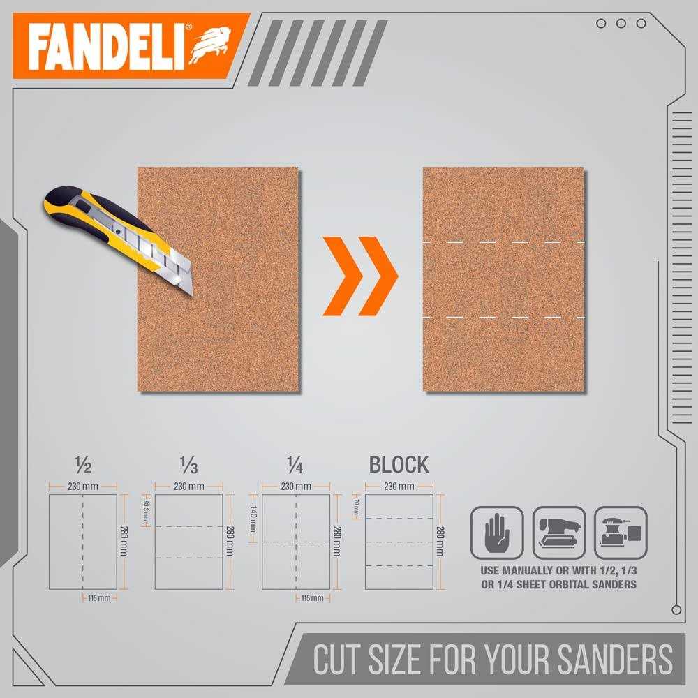 Fandeli 36025 Multipurpose 100 Grit, 9-Inch by 11-Inch Sandpaper Sheets are made of super heavy paper that works on all surfaces. Features high quality aluminum oxide mineral for longer lasting sheets, less clogging, and less waste. Sold as a package containing 25-sheets. Regardless of your finishing application, Fandeli can help you get the job done with its full line of quality coated abrasives from a name you can trust. Fandeli is proud of its more than 85 years of history as an integrated manufacturer of quality coated abrasives. Fandeli has invested heavily in state-of-the-art equipment and quality control systems and this allows Fandeli to maintain a high standard of quality demanded by the retail market.