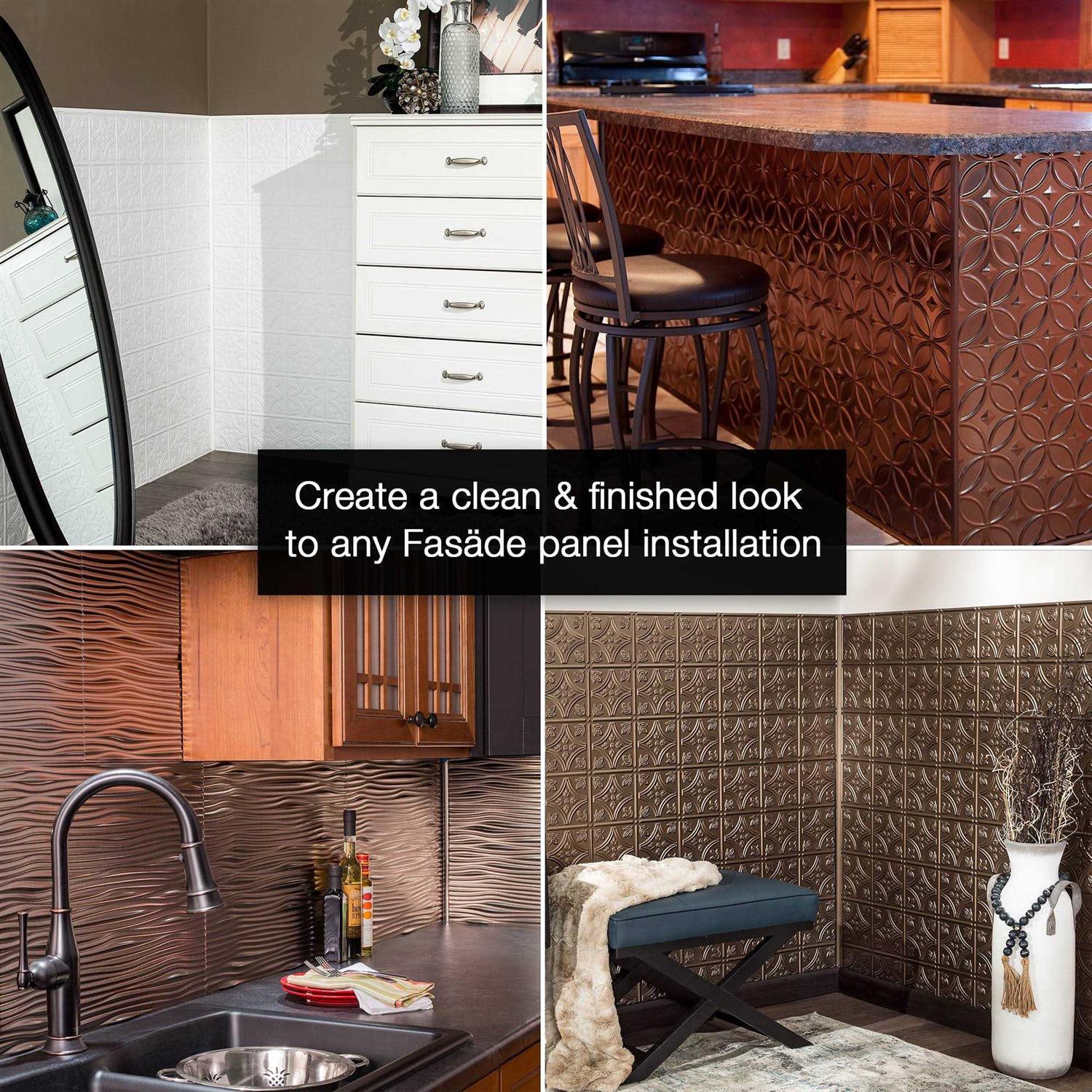 The Fasade Outside Corner Trim is made from durable PVC and is easy to cut for installation. This trim is a great way to add an attractive finishing touch to an outside corner on your backsplash or wall panel project. These trim colors allow for coordination with other Fasade products to give your design project a stylish look.