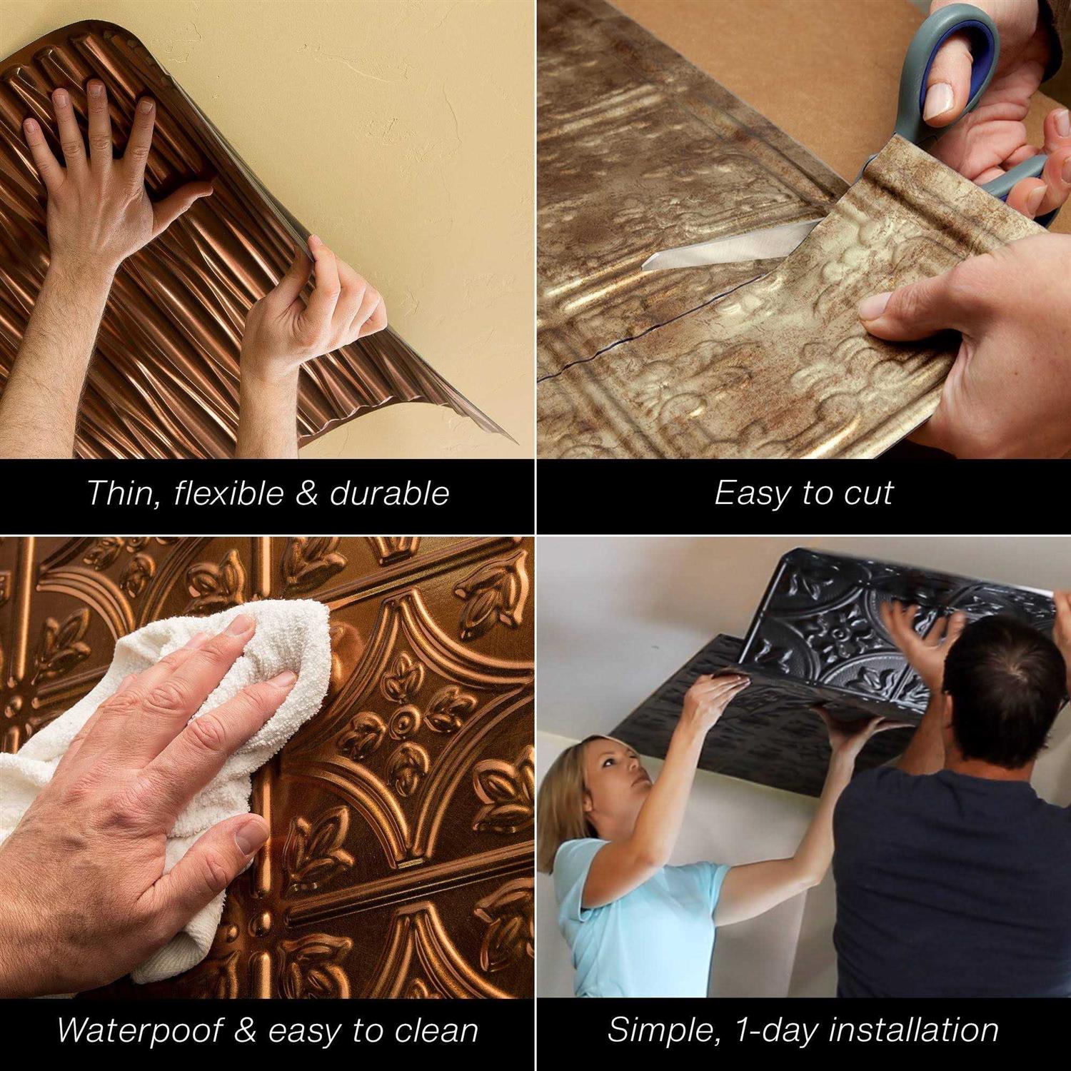 Beautiful, decorative and affordable faux tin ceiling tiles are easily installed — as glue-up panels or into new or existing ceiling grid systems. Our Fasade ceiling panels require no maintenance and are easy to clean and install. Perfect for any living room, dining area, kitchen, basement or bathroom. Available in 25 styles and 17 beautiful color finishes for hundreds of options to fit your decor.