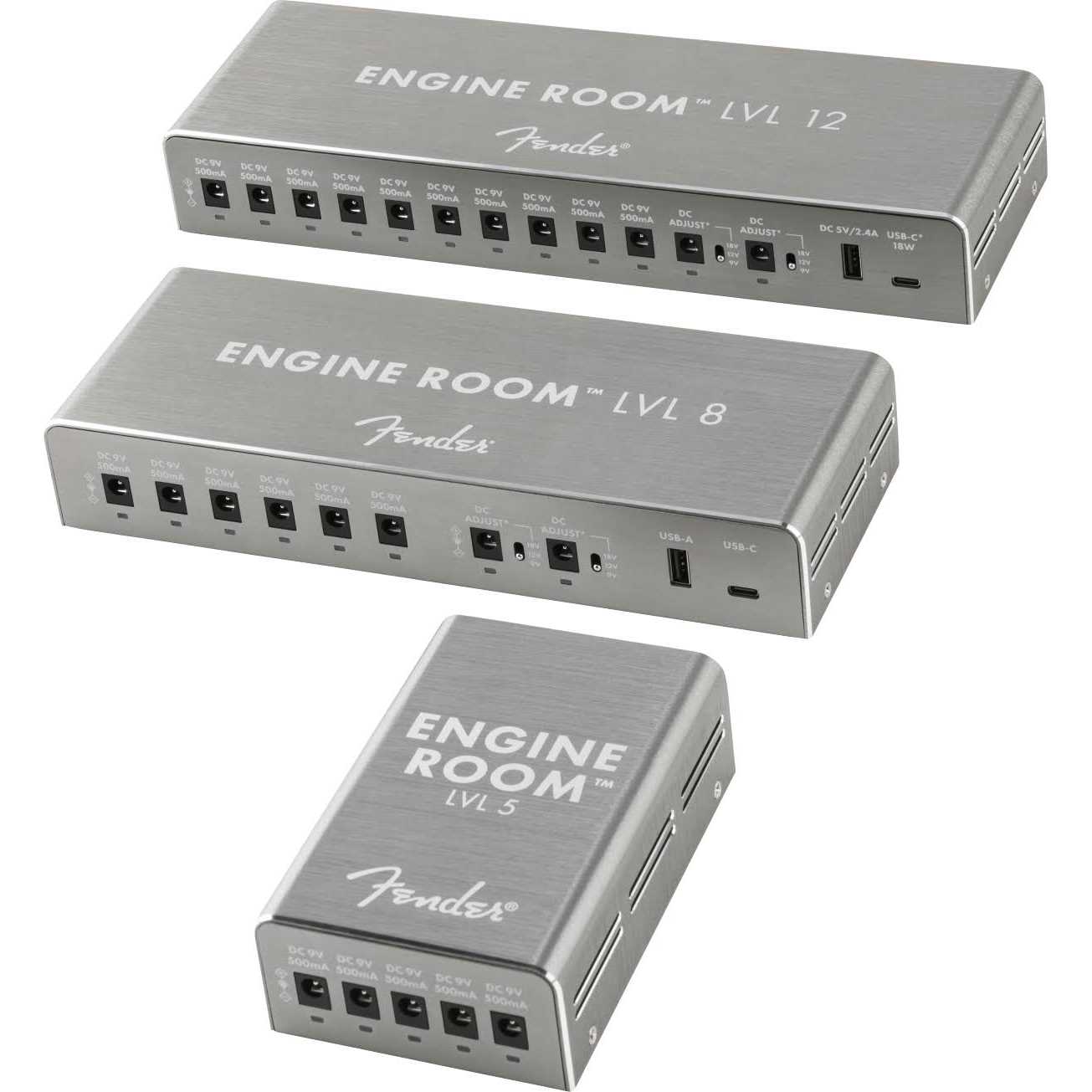 Pedals need clean, isolated power and Fender s Engine Room LVL5 Power Supply is capable of the task. Featuring five ground isolated power outlets, each outlet is capable of 9Vdc at 500mA to keep your pedals performing at their peak. Works as a standalone power supply for smaller pedalboards or can be daisy-chained with our LVL 12 for those tone fanatics with larger boards. The Engine Room Power Supply was designed by our in-house team of experts in Southern California. The chassis is crafted from lightweight, durable anodized aluminum, and its sleek, low-profile appearance is engineered to accommodate most pedalboards. Also features a 2-color LED indicator for each output, green indicating current consumption. Road-tested and ready for live or studio use, Fender s Engine Room Power Supply is built to power your performance.