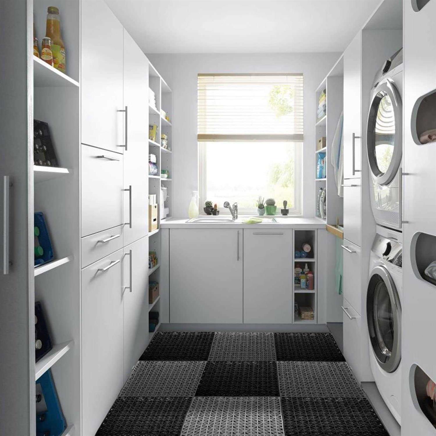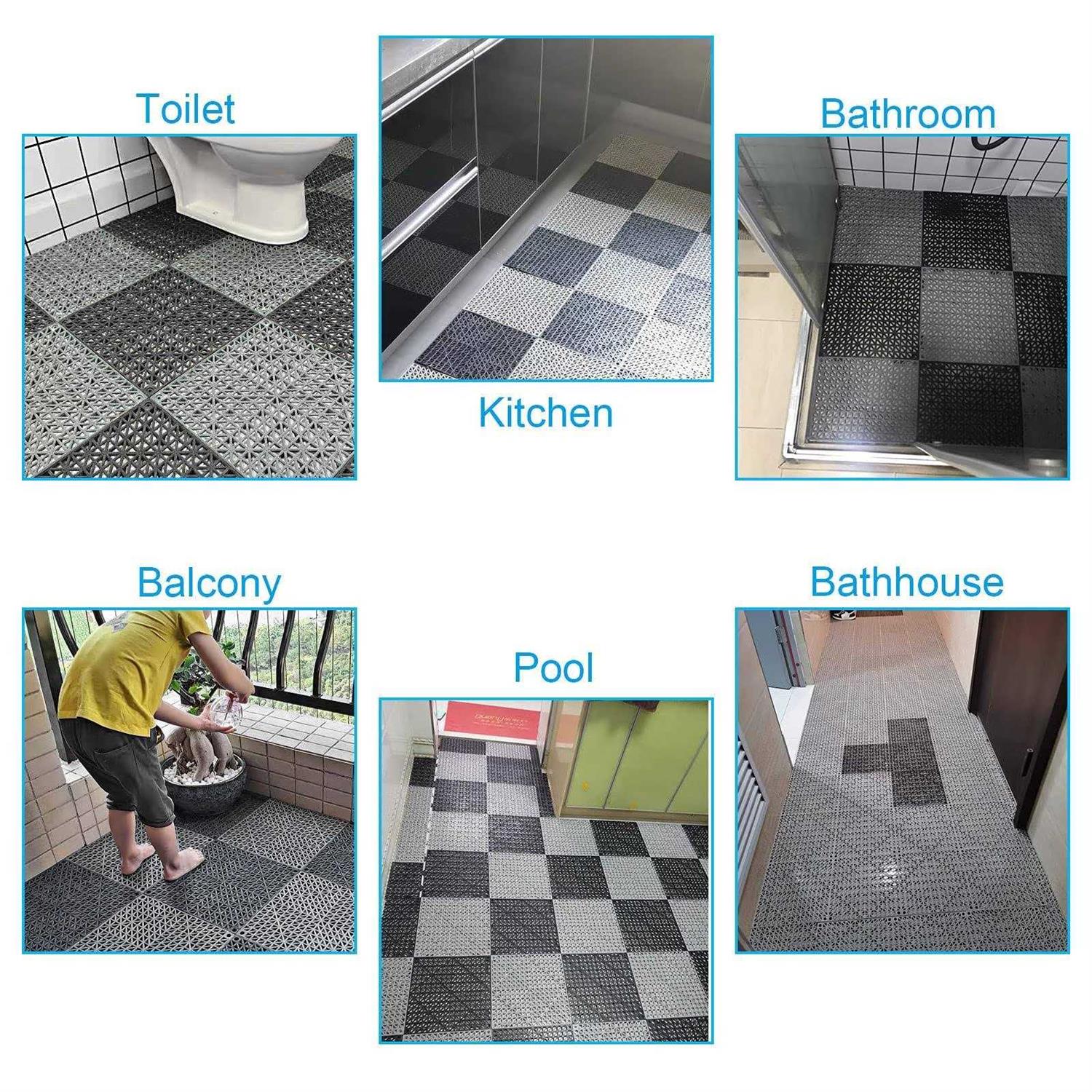 【Safe & Premium Material】12″ interlocking shower mats are constructed of blend of flexible PVC, durability and safe. (Each mat is 1 pound, thickness is 1.2cm) 【Anti-skid & Soft】 Anti-skid advantages can prevent dangerous accidents especially for pregnant woman, the aged, children. Soft pool mats are comfort to walk on, have the anti-fatigue qualities similar to rubber flooring, soothes and gently massages tired feet. 【Multipurpose】Our rubber outdoor tiles are weatherproof and UV resistant, widely use in Commercia & Residential. Commercial Applications:Allow to install around the swimming pool, locker-room, hot spring bathing pool, sauna/SPAS room, hotels, as well use in sports facilities or flooring in boats, and so on. Residential Applications: Perfect for shower rooms, workout or rest areas, under plant pot, laundry room and anywhere anti-slip tiles are desired. 【DIY Wet Area Tile】These splicing shower mats are 11.8 x 11.8 in(30*30cm)/Piece, easy to trim to your desired size so that custom shaped areas and re-configurable. Design for any wet or slippery environment, indoor or outdoor applications. 【Easy to Clean】 Simply hose down the outdoor flooring tiles and let the self-draining design allow for the dirt and debris to be swept away. Cleanup with a scrub brush and soap when use it for a while. Indoor or Outdoor Use Multi-functional drainage floor tiles design for any wet or slippery environment, UV resistant for indoor or outdoor applications. –Soft & Anti-skid Anti-skid advantages can prevent dangerous accidents especially for pregnant woman, the aged, children. Anti-fatigue qualities similar to rubber flooring, soothes and gently massages tired feet. Easy Installation Simply snap together the tiles and create custom configuration on site. No tools or glue needed. Can be assembled or disassembled for storage or easy transportation. -Easy to Clean Simply hose down the floor and let the self-draining design allow for the dirt and debris to be swept away. Cleanup with a scrub brush and soap when use it for a while. –Quick Water Drain Densely drainage hole design, so that quick water drain, and promotes airflow under the tiles. –Recommended Floor Materials Concrete, Wood, Tile, or Worn Decks. Specifications: Color: Gray+BlackShape: SquareMaterial: Soft PVCSize: 30 x 30cm/11.8 x 11.8 inch( Each tile) Installation: With lock-in systemPackage Included: 12PCS Interlocking Rubber Floor Tile Mats