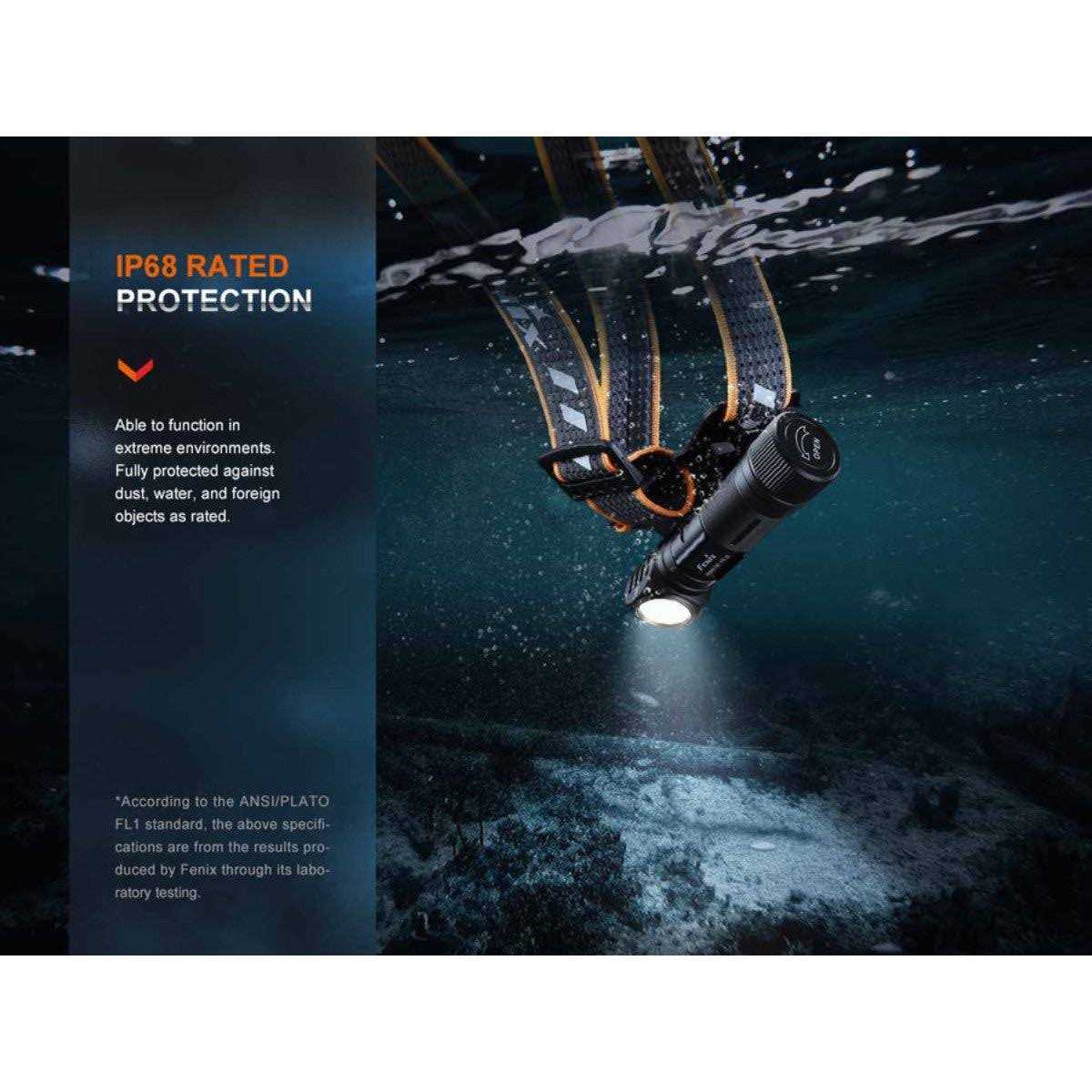Versatile and reliable, the Fenix HM61R v2.0 emits up to 1600 lumen from its primary white LED, and is an ideal headlamp flashlight for industrial users, campers, hikers, runners, backpackers, and more. The beam is a wide angle flood that can reach up to 177 yards. Easily switch from white light to red light to preserve night vision for map reading and navigation or a flashing red beacon as a warning signal. Need a handheld flashlight instead? The HM61R v2.0 can be slid off the bracket to be used as a 90 degree right angle flashlight with a clip. Go hands-free by attaching the magnetic tail to a metal surface. Powered by the included 3400mAh rechargeable battery, the HM61R v2.0 can run for up to 300 hours on the lowest mode. When the battery is low, simply charge the light by attaching the included Fenix magnetic charging cable with the light and connect the other end to a USB power source. Made to be comfortable and safe, the headlamp is paired with a reflective and breathable headband. Made from durable materials, the light itself can withstand extreme temperatures ranging from -31 to 113 degrees F. Given an IP68 waterproof rating, this headlamp can tolerate any harsh outdoor environments.