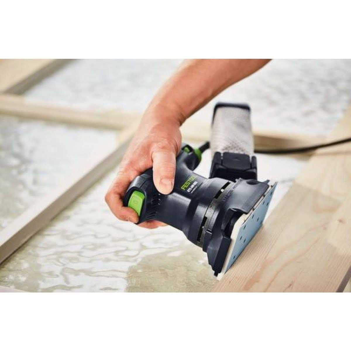 The RTS 400 REQ detail sander features a more powerful 250W motor, edge guard, new locking dust port, rubberized grip and larger switch for improved ergonomics. Ideal for removing paint or other finish, or sanding window and door frames, panelling on a workbench or installed prior to finishing. Sand right up to adjacent surfaces The orbital motion allows the sander to get right into corners without damaging the adjacent surface. Use the Protector to protect adjacent surfaces from accidental pad contact, or remove it for sanding right into the corner. Compact and lightweight With a compact form factor, this sander is deal for working on flat, vertical, and overhead surfaces. It weighs only 2.4 pounds. The motor is balanced and grip rubberized to reduce fatigue during long sanding sessions. Easy to control The 2 millimetre orbital motion provides good control on edges and into corners. A true finish sander The MMC Electronics provide step-less variable speed and 250 watts of power. Paired with a short 2.0 mm stroke, this sander provides a super-fine surface.