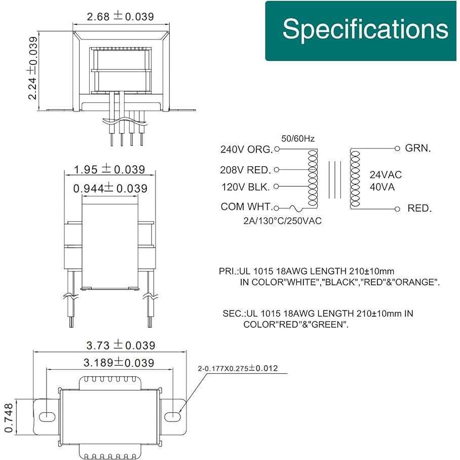 Fiada Control Transformer 40VA, Primary 120, 208, 240V Secondary 24V, HVAC Furnace Multi Tap