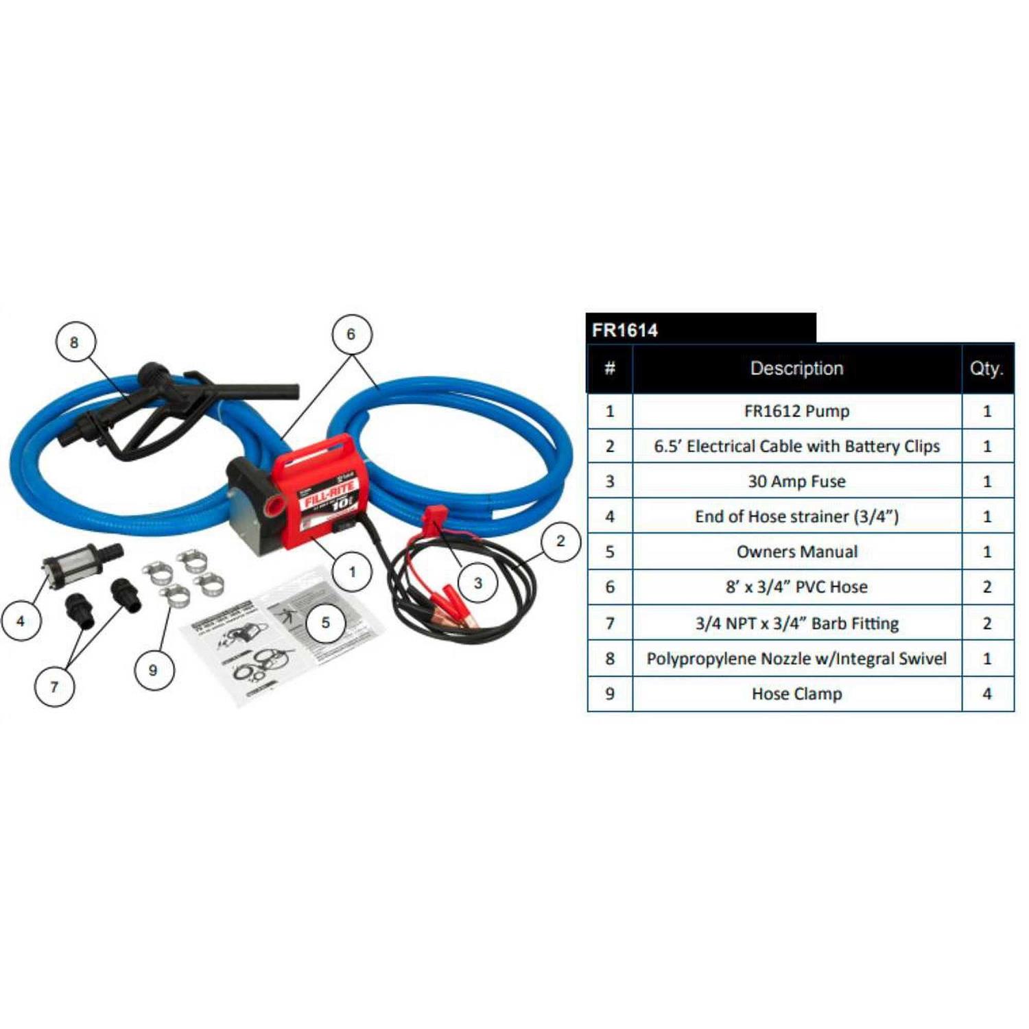 Features and Benefits:. Includes battery cable with clips. 8′ of 3/4” hose – Pick up tube strainer and plastic ¾” nozzle. Compatible with Diesel and Antifreeze. 10 GPM flow rate. This light duty rotary vane transfer pump is portable and self priming. The pump is cast iron and produces a flow rate of 10 GPM. It is powered by DC voltage. Battery cable with clips is included. As a complete pump kit it also has 8” of 3/4” hose pick up strainer for the inlet and outlet and a plastic 3/4” plastic nozzle. The pump is compatible with diesel and antifreeze fluids.