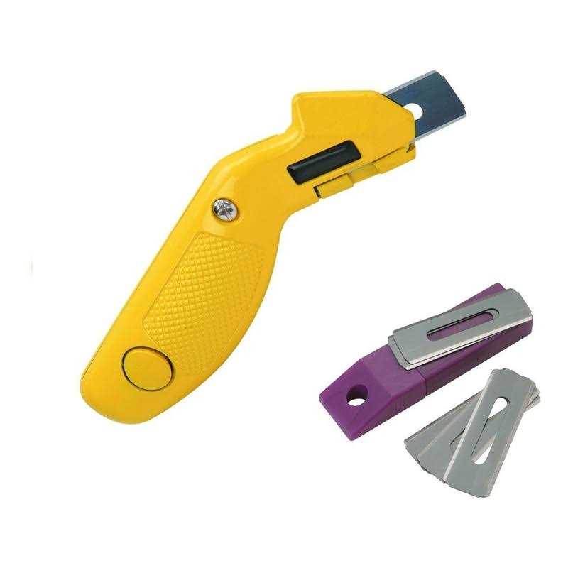This pivoting carpet knife cuts thick carpet that other cutting tools can’t handle. The knife features a handle with magnetized blade storage, an angled head with thumb guard and a button for quick opening and closing. This ergonomic cutting tool cuts smoothly with a double-edge steel blade designed specifically for carpets.