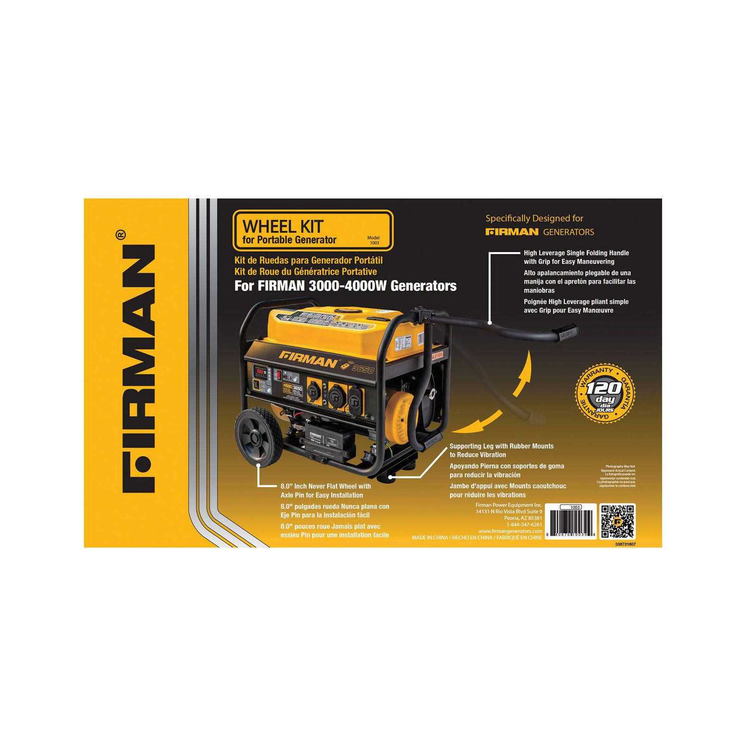 Made specifically for Firman Power Equipment Generators, this wheel kit was designed for ease of portability, strength, and durability. Includes: two-8.0″ Never Flat Wheels with Axle Pin for easy installation, high leverage Single Folding Handle with Grip for easy maneuvering, supporting leg with Rubber Mounts to reduce vibration, and all hardware and tools necessary for assembly. Dimensions: 17.7″L x 10.9″W x 3.2″H.