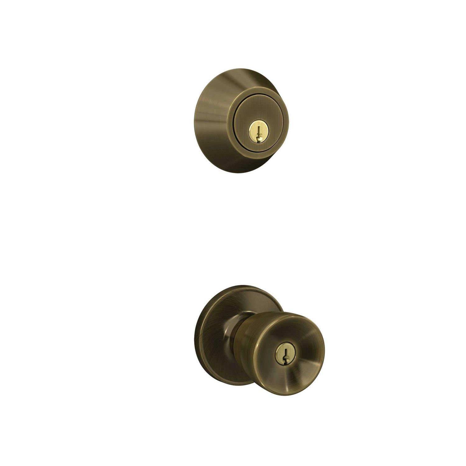 The First Secure by Schlage Antique Brass Single Cylinder Deadbolt and Hawkins Keyed Entry Knob offers strength and durability from a reputable name in security at an exceptional value. It is ideal for when you want added security on residential exterior doors. Plus, it is backed by our limited lifetime mechanical guarantee.