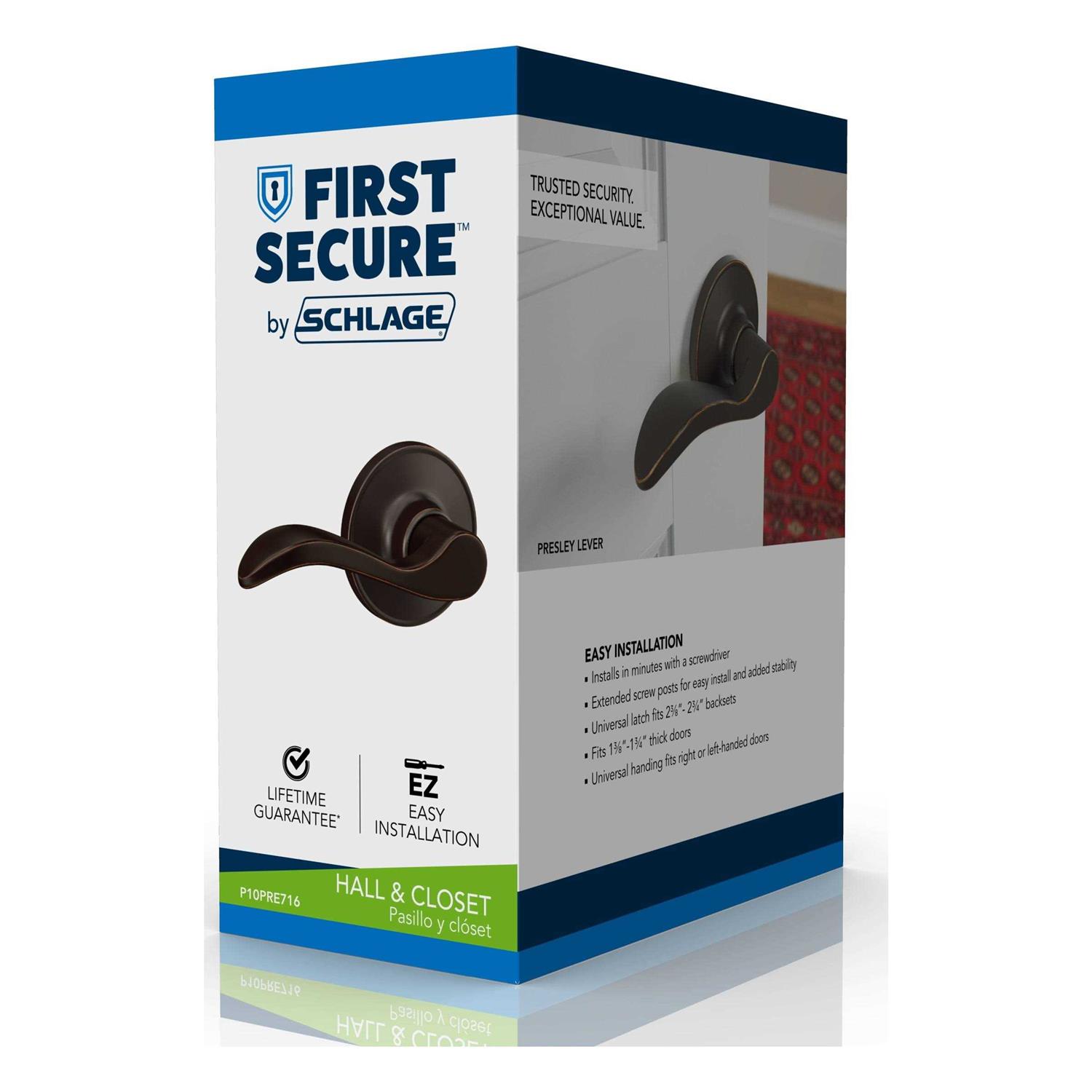 The First Secure by Schlage Presley Aged Bronze Hall/Closet Passage Lever offers durability and convenience from a reputable name in door hardware at an exceptional value. It is non-locking and ideal for interior hall and closet doors. Plus, it is backed by our limited lifetime mechanical guarantee.
