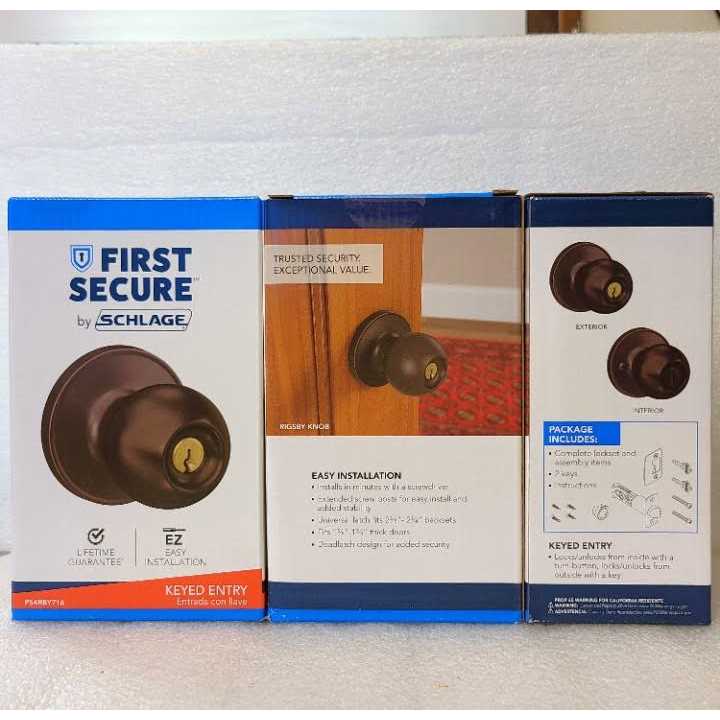 The First Secure by Schlage Rigsby Aged Bronze Keyed Entry Knob offers strength and durability from a reputable name in security at an exceptional value. It is ideal for adding security on residential exterior doors. Plus, it is backed by our limited lifetime mechanical guarantee.