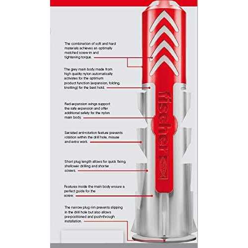 Combination of two material components for more performance. Secure functions for solid (expansion) and hollow and panel building materials (folding/knotting). Easy installation: narrow edge of the plug prevents it from falling deeper into the drill hole. Best possible feedback from the anchor – you can feel that the anchor is sitting perfectly. Comes with 50 anchors and screws included. The fischer DUOPOWER offers very good hold values as a result of its 2 components: Depending on the building material, the grey components made from high quality nylon automatically activates the optimum product function (expansion, folding, knotting) for the best hold. The expansion wings of the red component support the secure expansion and offer additional security to the grey component. Easy screwing-in of the screw and correct “tightening” to close. No over-tightening of the screw. The pre-shaped edge on the plug head prevents the plug from slipping into the drill hole.