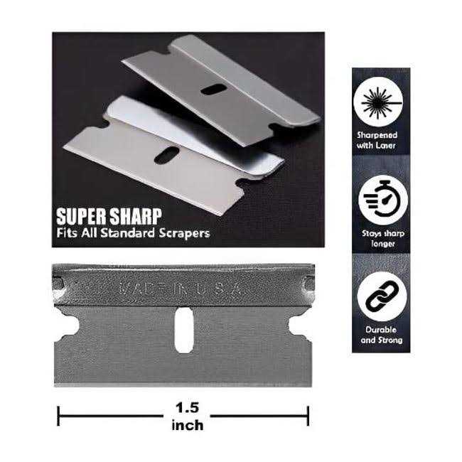 50 Pieces of Single Edge Razor Blades.. Fits All Safety Standard Scrapers- Single Edge Holders! Constructed from High Carbon Steel and Chrome Vanadium Perfect for Removing Paint and Decals Heavy Duty, Super Strong, Extra Sharp! Each Blade is individually wrapped to protect the edge until you are ready to use! 50 Pieces of Single Edge Razor Blades.. Fits All Safety Standard Scrapers- Single Edge Holders! Constructed from High Carbon Steel and Chrome Vanadium Perfect for Removing Paint and Decals Heavy Duty, Super Strong, Extra Sharp! Each Blade is individually wrapped to protect the edge until you are ready to use! Constructed from High Carbon Steel. Perfect for Removing Paint and Decals. All of our Products Manufactured In the USA!!