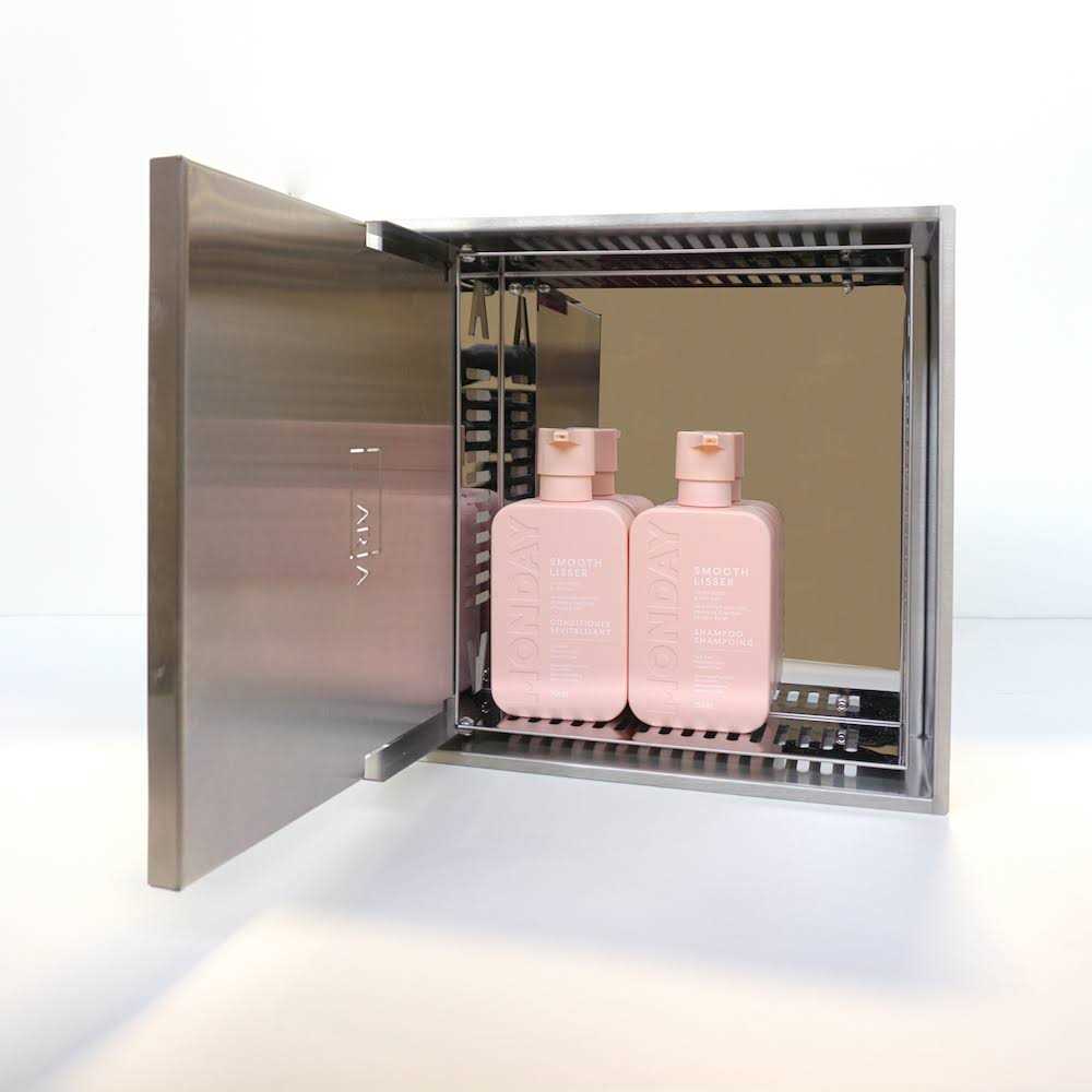 Minimalist, drop-in niche designed with a hinged door to conceal unsightly shower toiletries. Customize door with surface material to blend seamlessly into the surrounding wall. 100% Manufactured in Canada