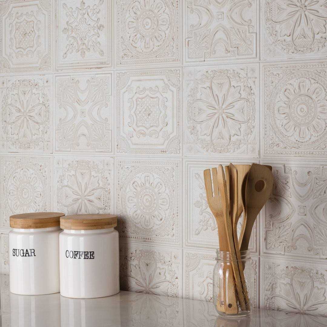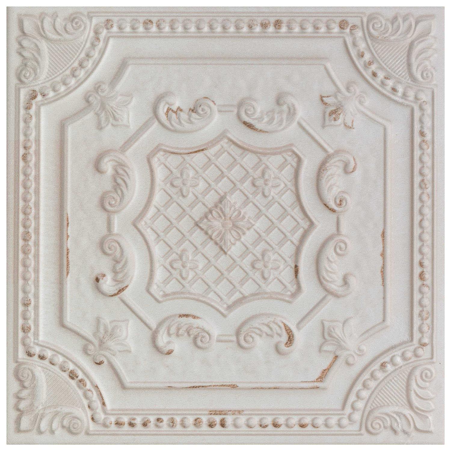 Reminiscent of antique tin ceiling tiles, our Fitz Ceramic Wall Tile offers authentic vintage appeal. This decorative square tile features embossed old-world motifs with splashes of glossy glazing. With a textured, mixed finish surface, this ceramic tile can blend into virtually any design theme, ranging from contemporary projects to traditional installations. Available in 40 print variations that are randomly scattered throughout each case, the variation throughout each tile mimics an authentic aged appearance. Its glazed feature makes it an ideal choice for indoor wall installations including kitchen backsplashes, bathroom showers, and fireplace facades. Tile is the better choice for your space. This tile is made from natural ingredients, making it a healthy choice as it is free from allergens, VOCs, formaldehyde, and PVC. 9.9 square feet, 22 pieces per case. Case weight is 23.1 lbs. Grade 1, first-quality ceramic tile for wall use. 8 in. width x 8 in. length x 0.27 in. thick. Unglazed, medium textured finish with a mixed finish and moderate variation in tone. PEI Rating 0 is suitable for wall use only.