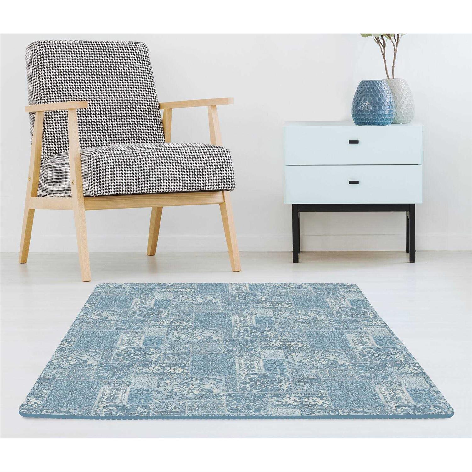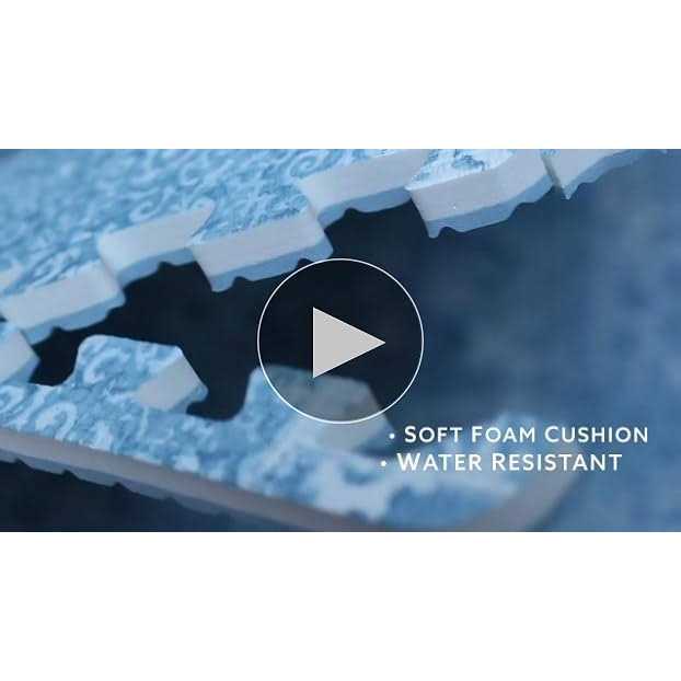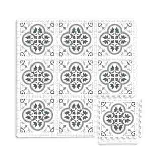 A rich and distressed, blue woven design adds a boho flair to floors with these foam tiles. Create a comforting space with this modern floor accent. Bazaar Interlocking Floor Tiles Floor Tiles contains 22 pieces on 9 sheets that measure 11.4 x 11.4 inches. This product measures 34.2-in by 34.2-in by .4-in when assembled.