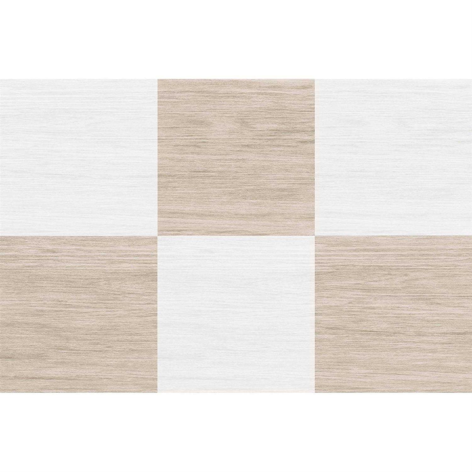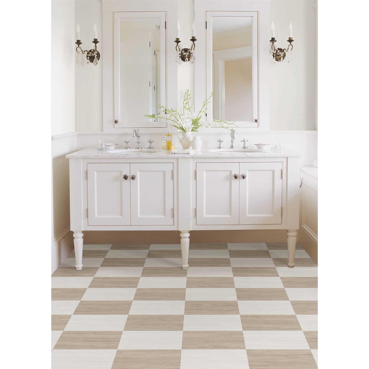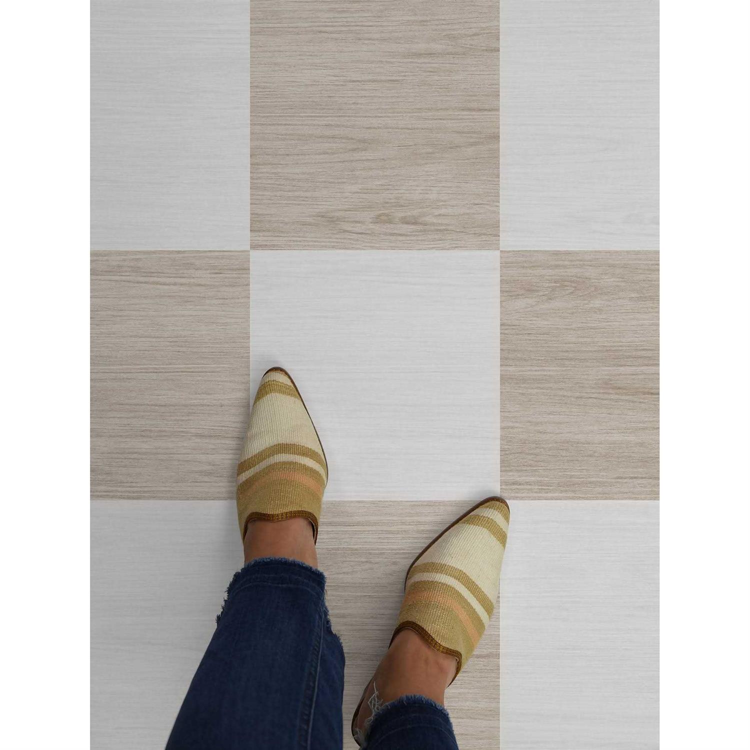 • Peel and stick FloorPops floor tiles with brown and creamy white wood-inspired patterns for a checkerboard floor design